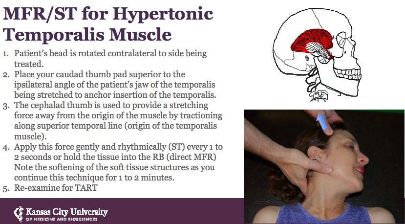 What is the correct setup and technique of MFR/ST for Hypertonic Temporalis M.?