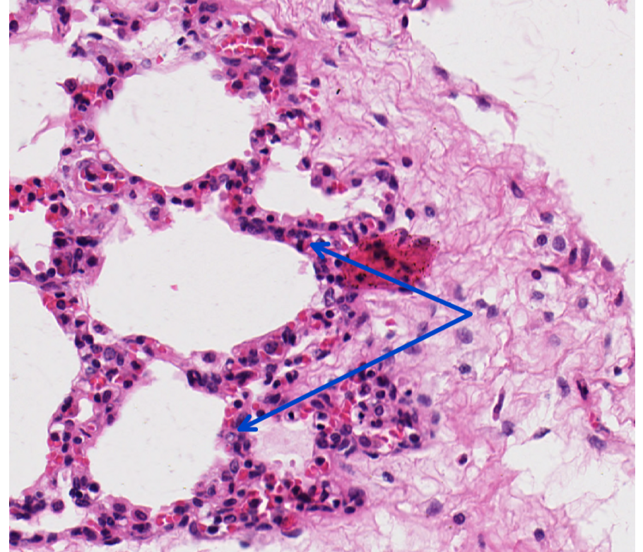 alveolar edema (with increased protein)