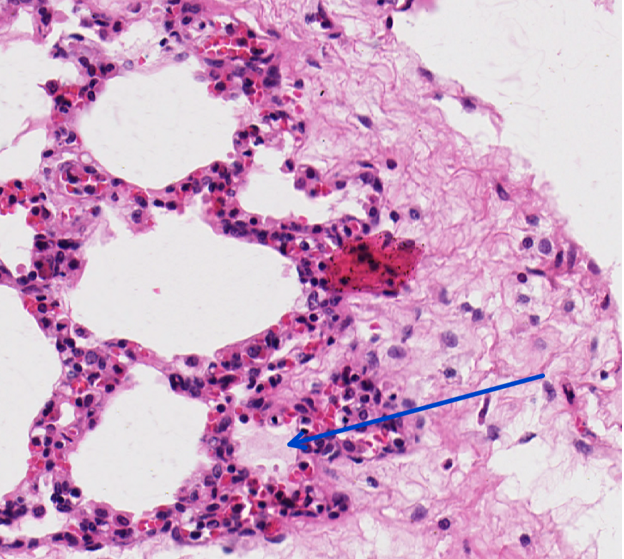 This is a slide from the lung of a pig, what is the pale pink material in alveoli?