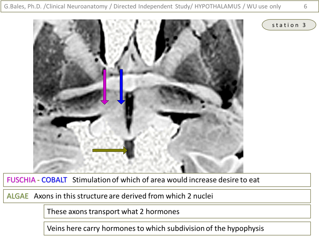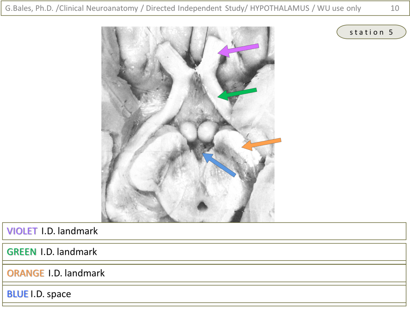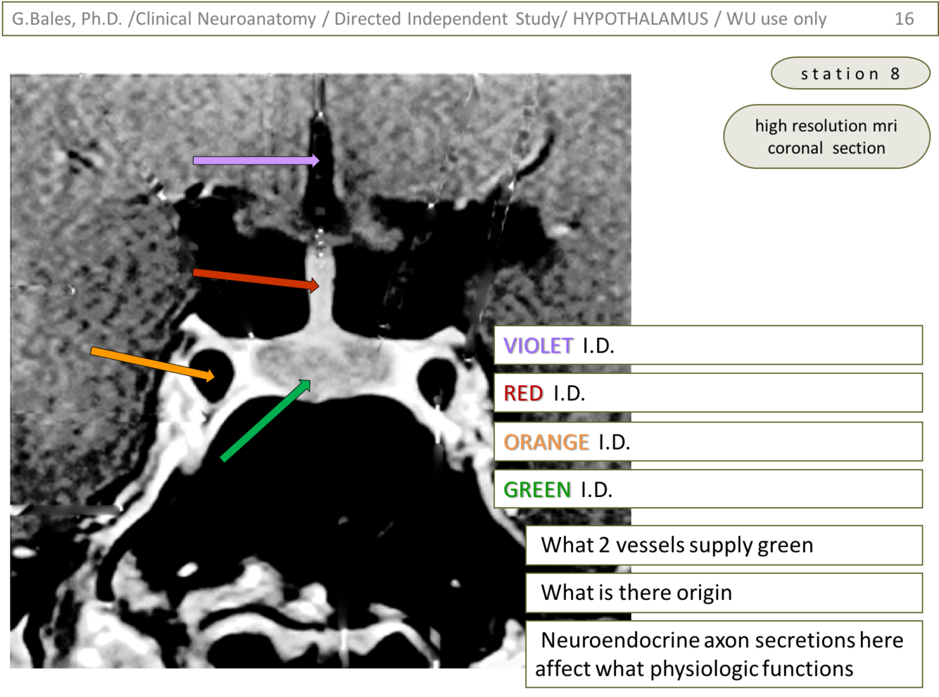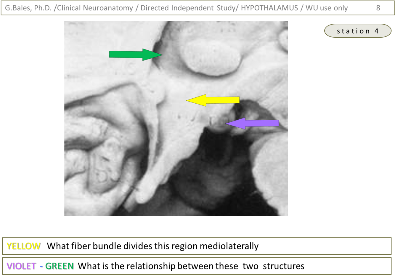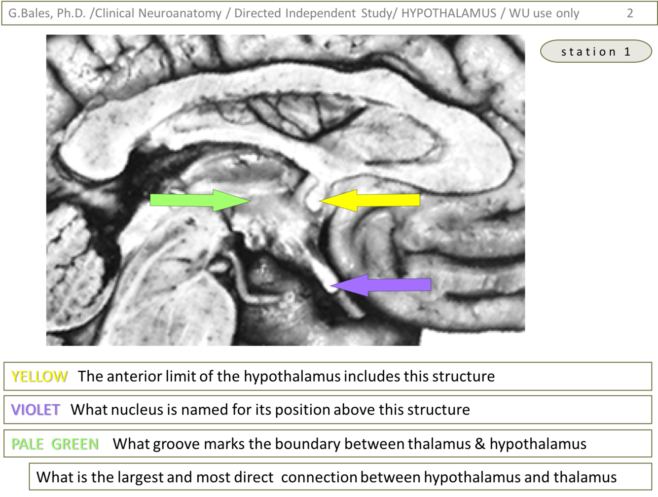 2) Violet is pointing to the mammillary body whereas the green is pointing to the thalamus. The mammillothalamic tract ascends into and through the thalamus to reach the anterior thalamic nucleus which is involved in the limbic system (emotion and memory (Papez circuit)) (Thalamus lecture – slide 26)