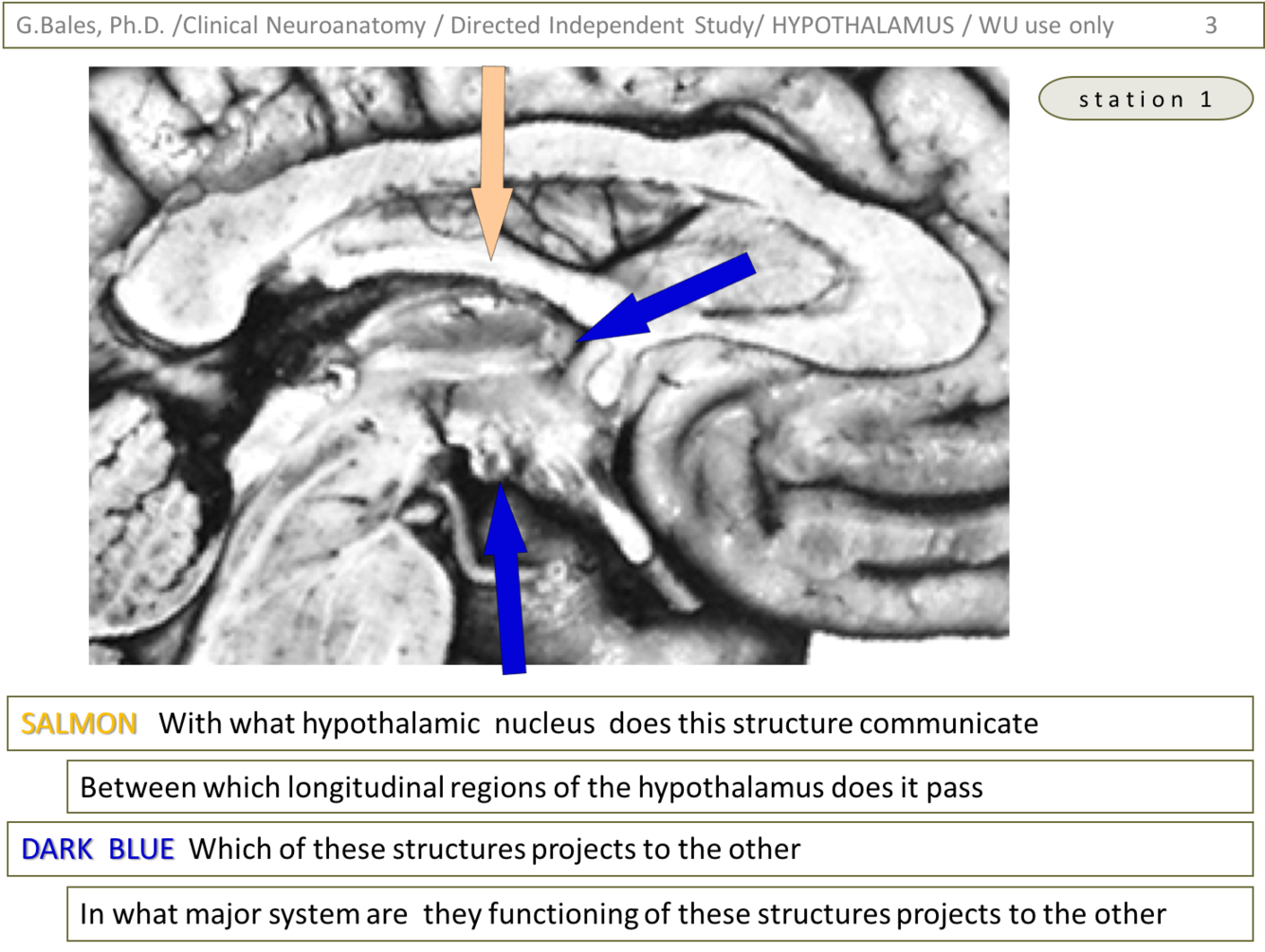 1) Salmon – this is the fornix and it communicates with the mammillary nucleus (connects this with the hippocampus) (Hypothalamus lecture – slide 8)