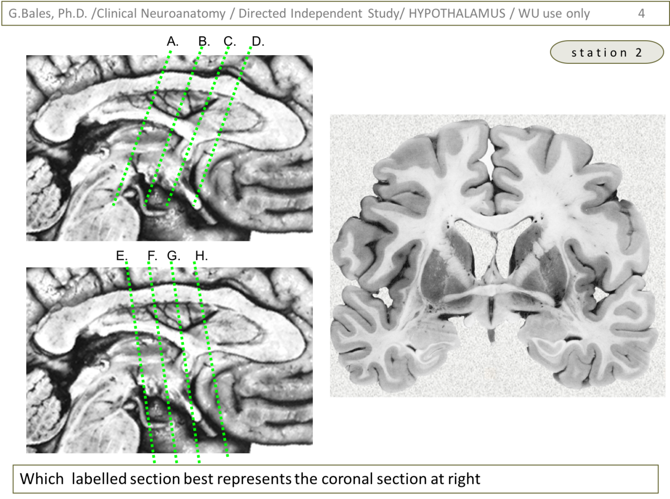 Reasoning: we can first determine the picture is more anterior than posterior due to the shape of the lateral ventricles (head = butterfly, body = hawk). This helps with eliminating A and B as well as E and F. After that, you can look at the temporal lobe to notice that there is a slight bit of a ‘scroll’ like figure which could be the hippocampal complex just caudal to the amygdala. This would help eliminate H. All that is left is C, D, and G. Notice the small rounded bulges just lateral and inferior to the 3rd ventricle. This should be the optic tracts. This would indicate that the slice should be posterior to the optic chiasm. Hence, the only one that now fits is ‘C’.
