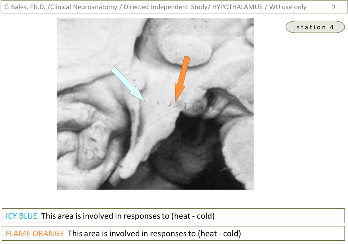 1) Icy blue – area involved in response to heat (regulates mechanisms of heat dissipation; Hypothalamus lecture – slide 30)