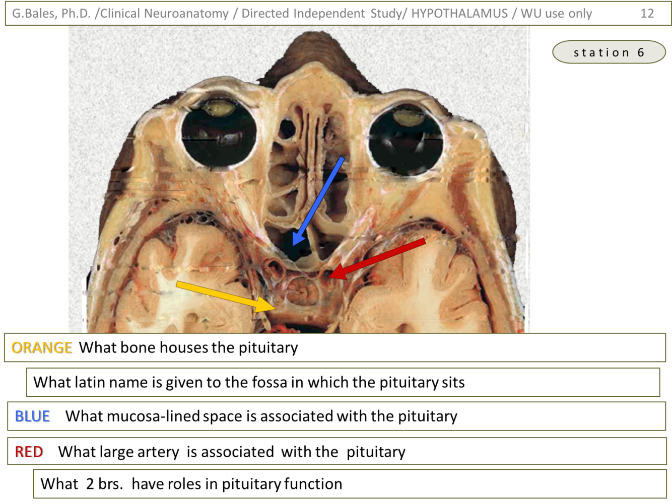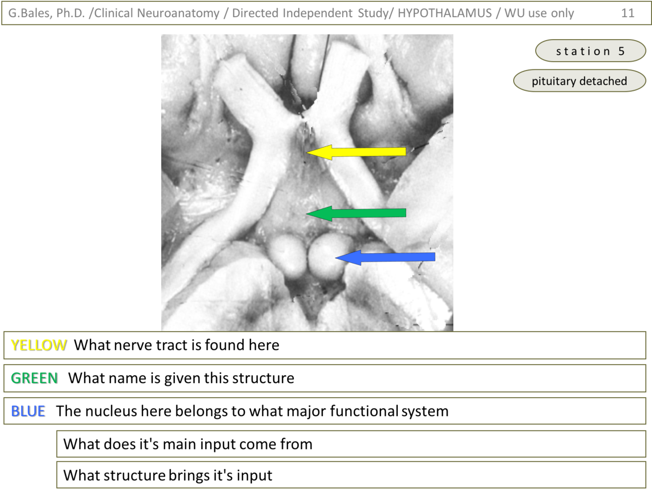 1) Yellow – nerve tract found here is the supraopticohypophyseal tract that runs in the infundibulum (Hypothalamus lecture – slide 41)
