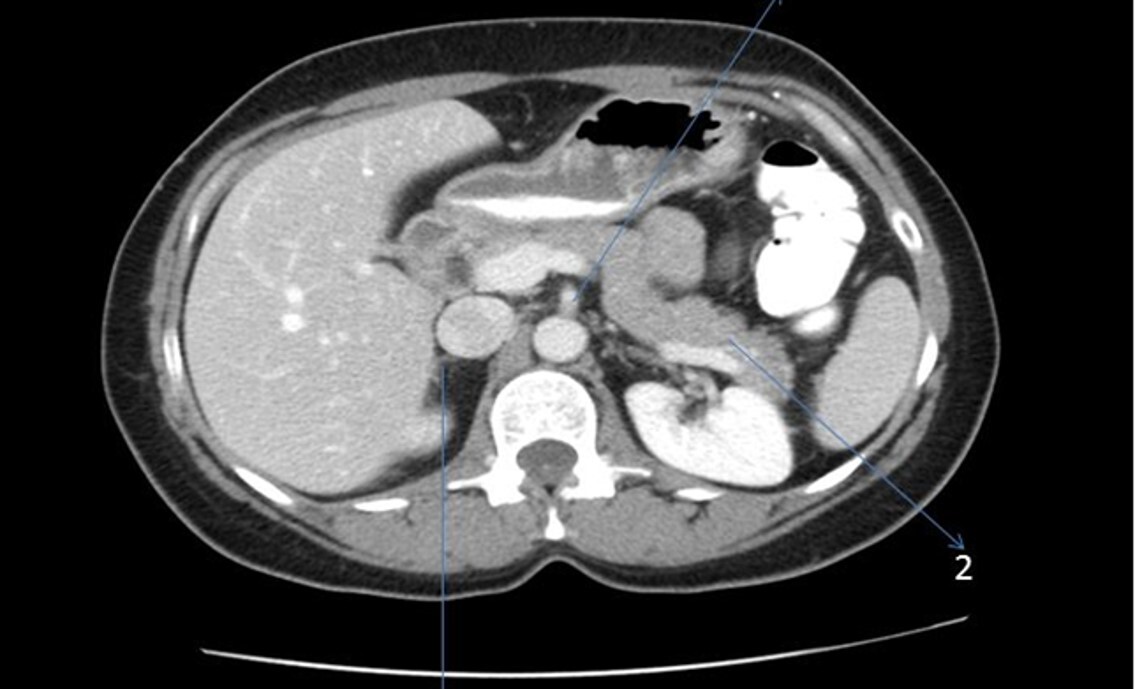 What phase of contrast enhancement is seen in the abdomen CT image?