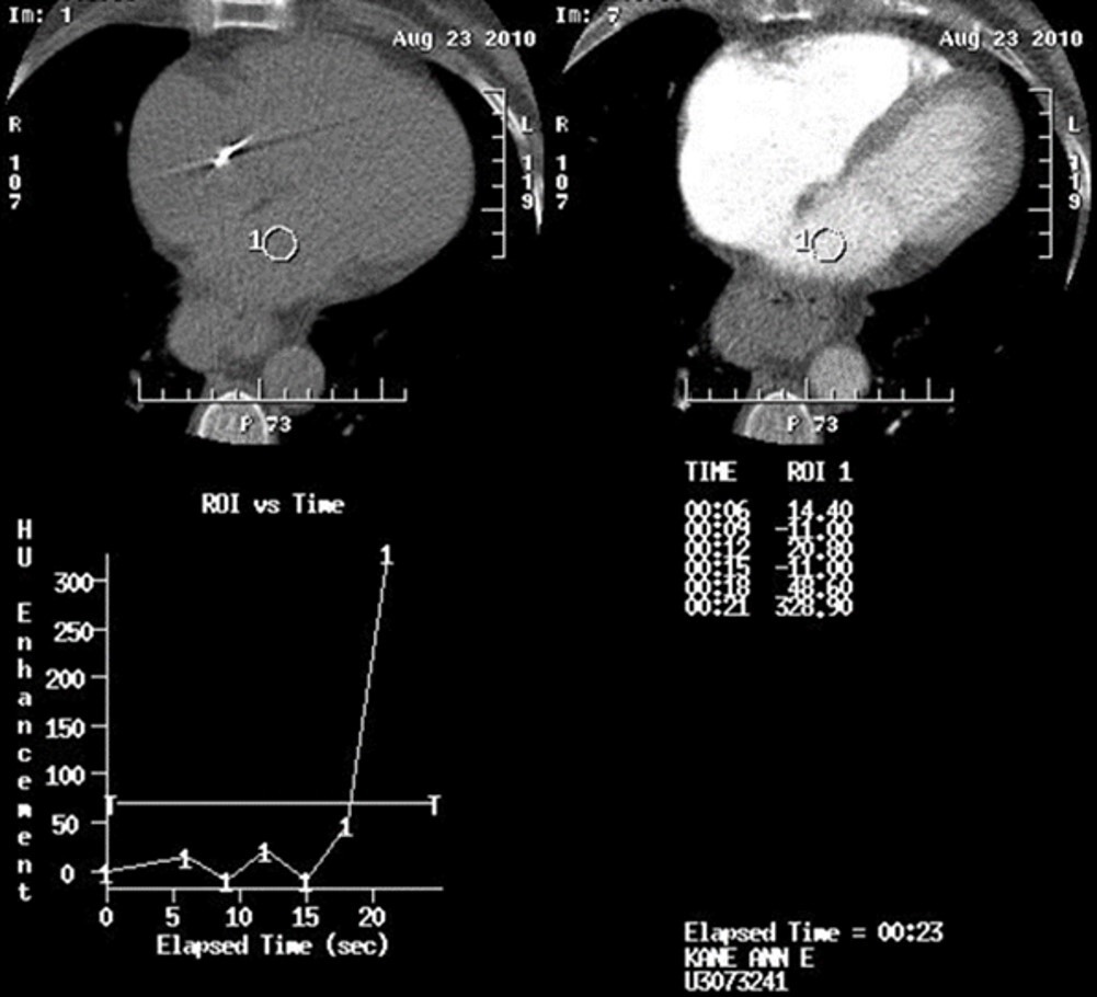 c. Time between the start of the intravenous contrast injection and the arrival of contrast in the heart