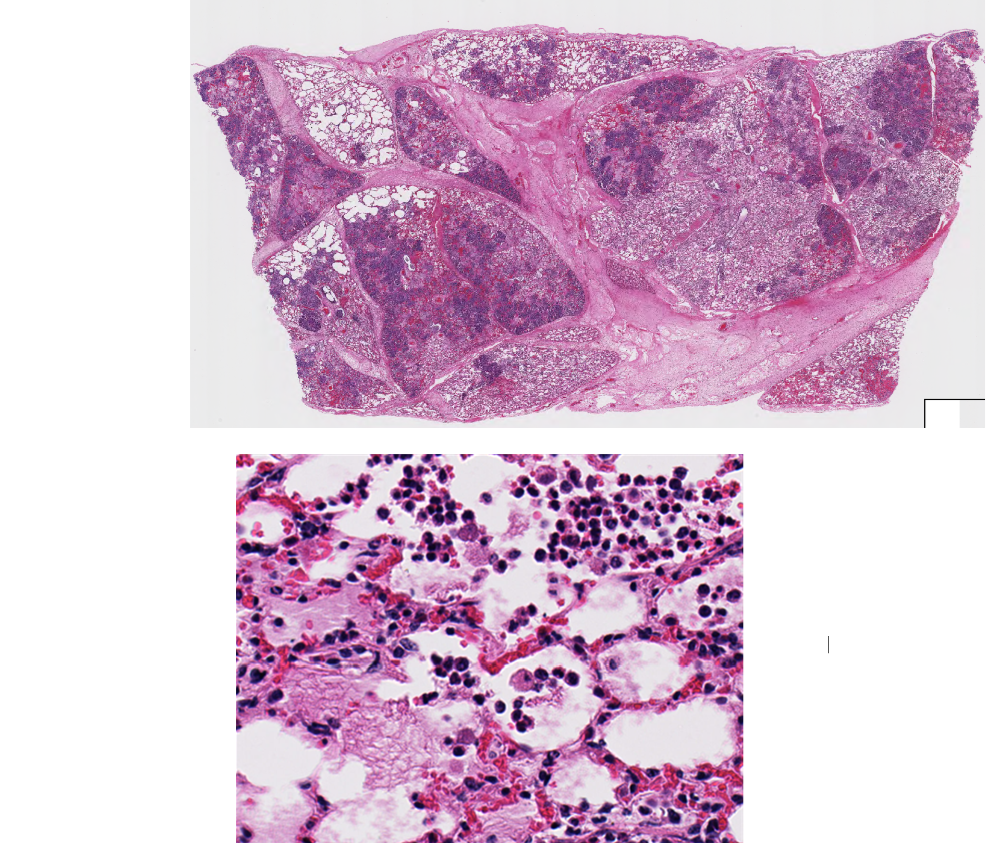 This is a slide from a bovine lung.What would the cellular exudate be composed of in this lesion?