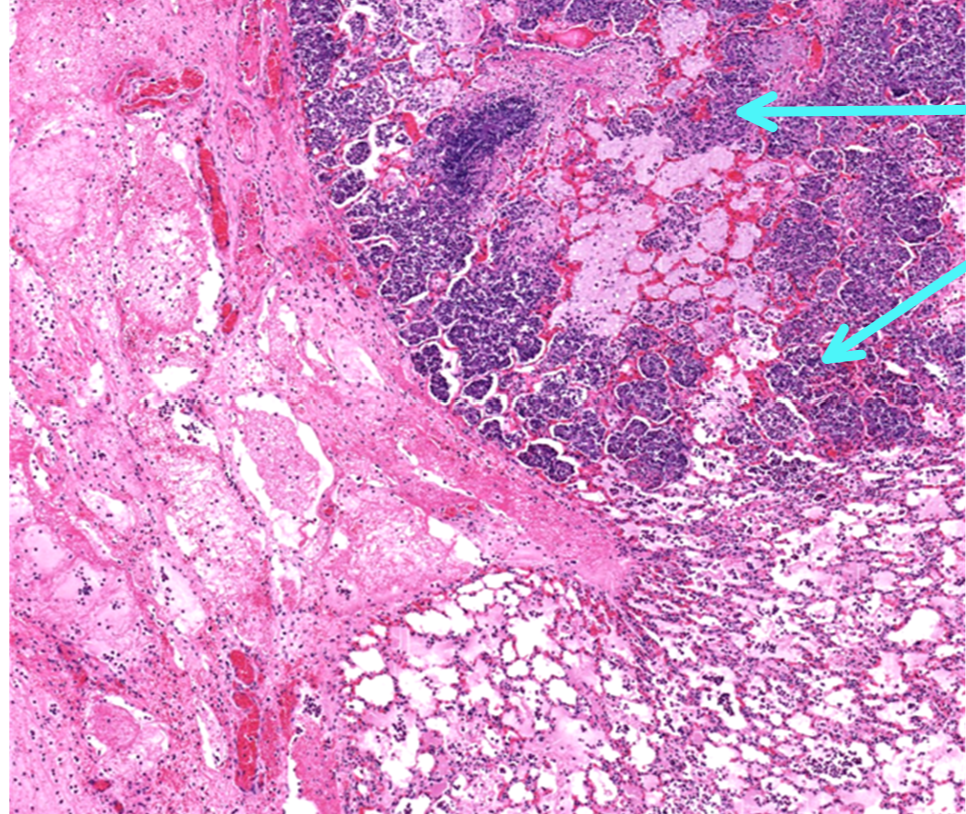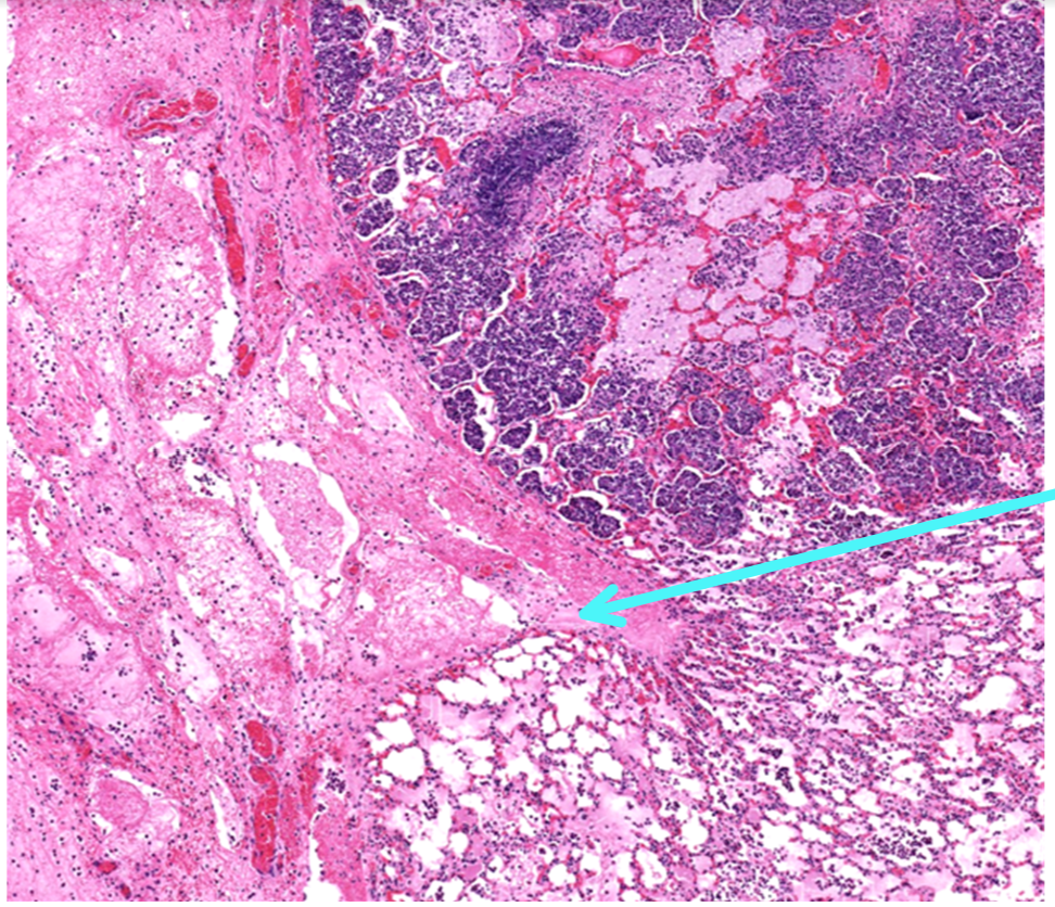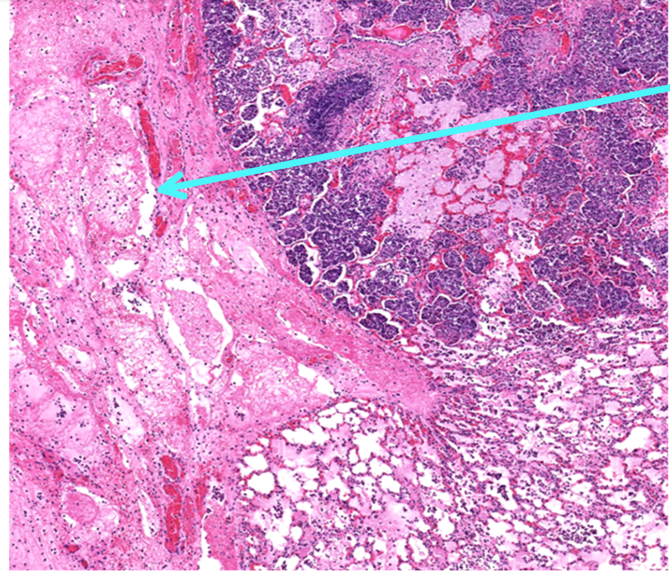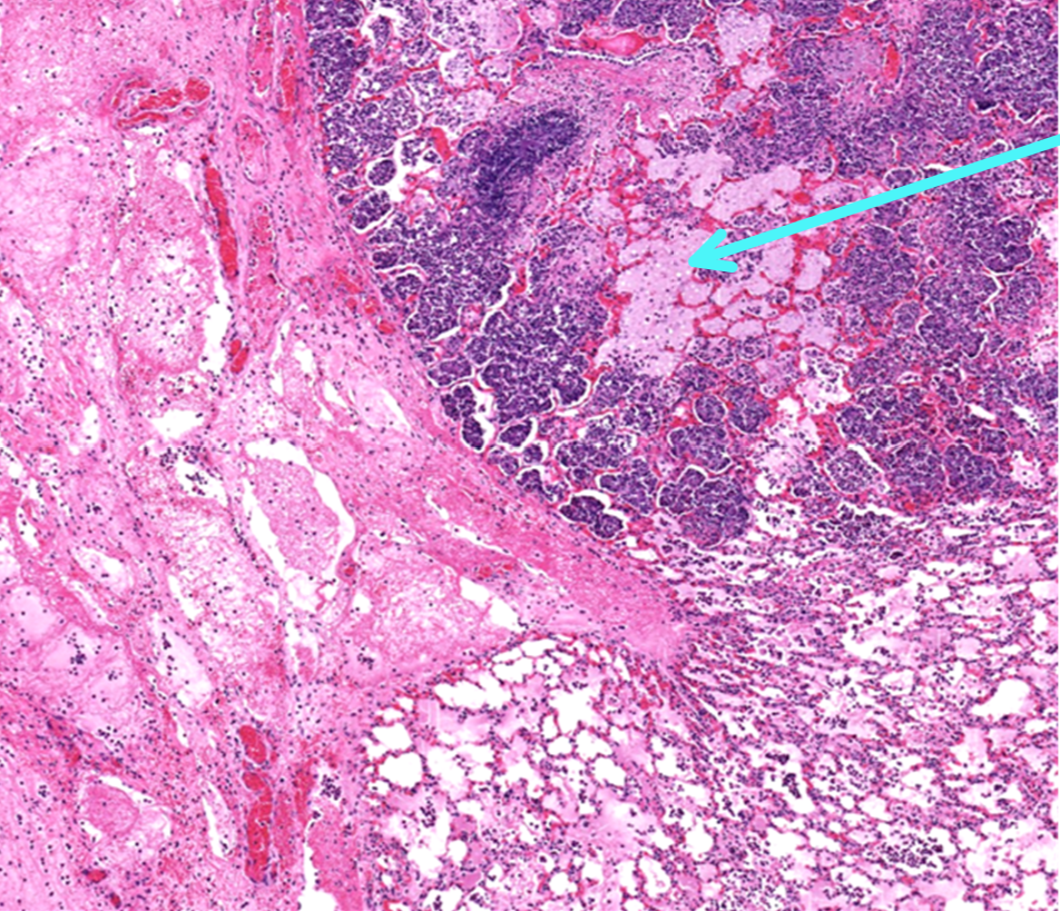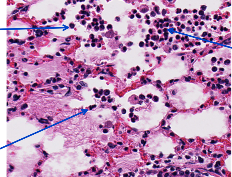 macrophages, neutrophils, and necrotic alveolar epithelium