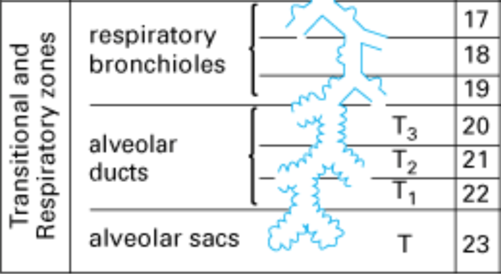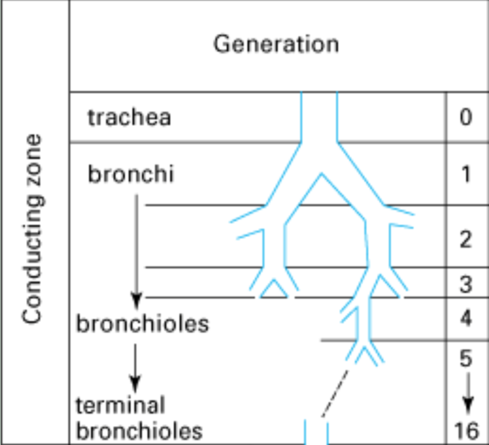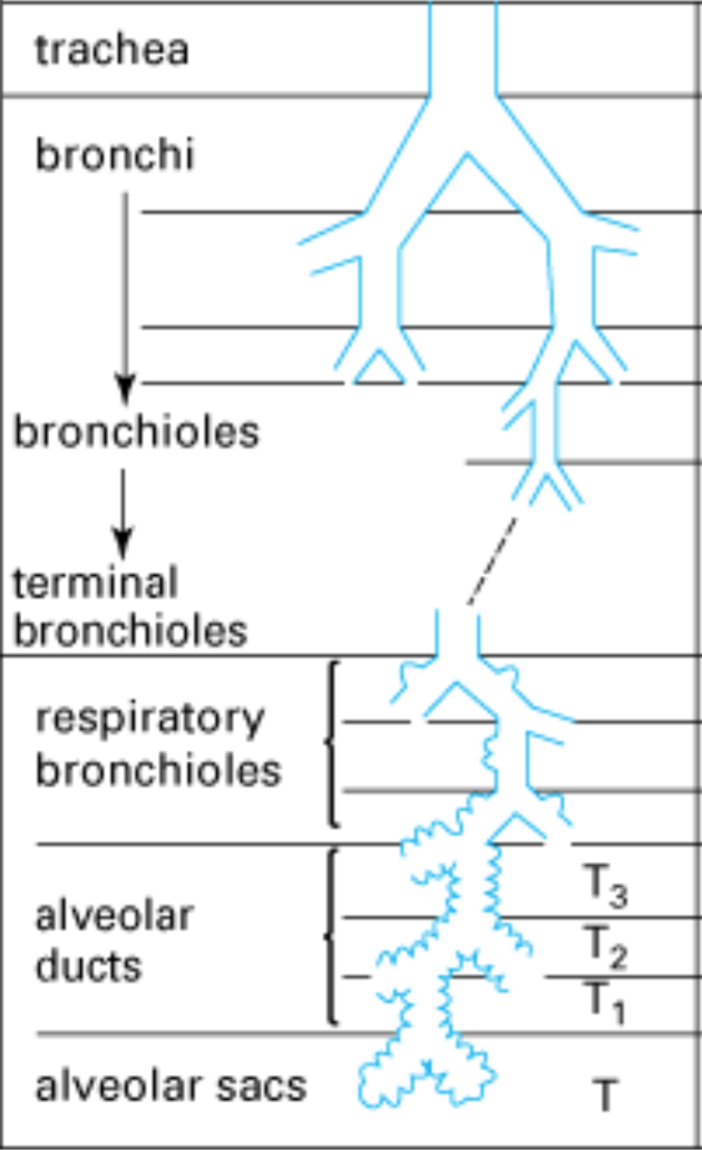 Airways –> bronchi –> bronchioles –> respiratory bronchioles –> alveolar ducts