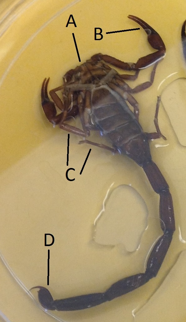 To what phylum, subphylum, class, genus, and species does this organism belong? What is it’s common name? Name the structures indicated. What structures aid in its predatory nature?