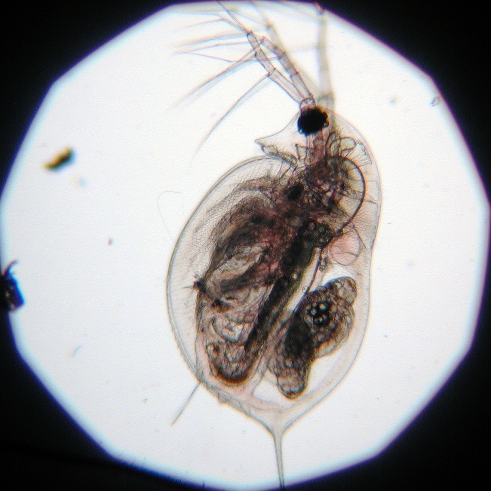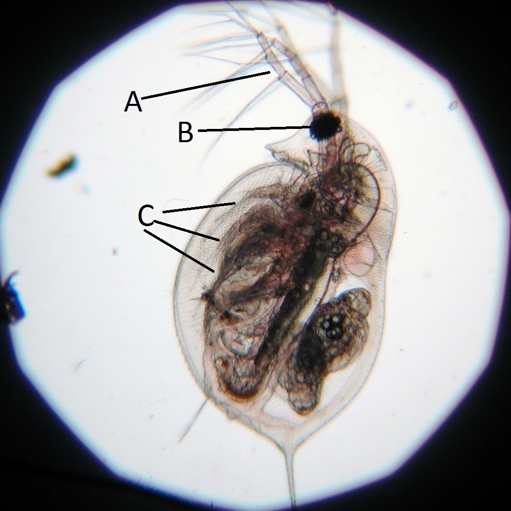 What is the phylum, subphylum, class, subclass, and genus of this organism? Does this organism have a carapace? How do the eyes differ from Daphnia pulex? What do the thoracic appendages appear to be used for?
