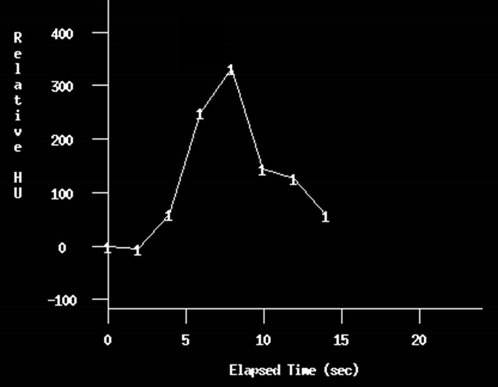 Your timing bolus series provides the following graph. If the scanner prep delay is 5 seconds, what would the total scan delay be, to ensure image acquisition occurs at optimal PA opacification?