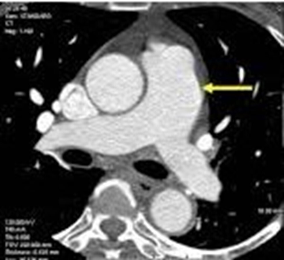 You end up with the following CTPE scan. An ROI placed in the pulmonary trunk yields a mean HU of 100. Is the scan optimal, yes or no, and why?
