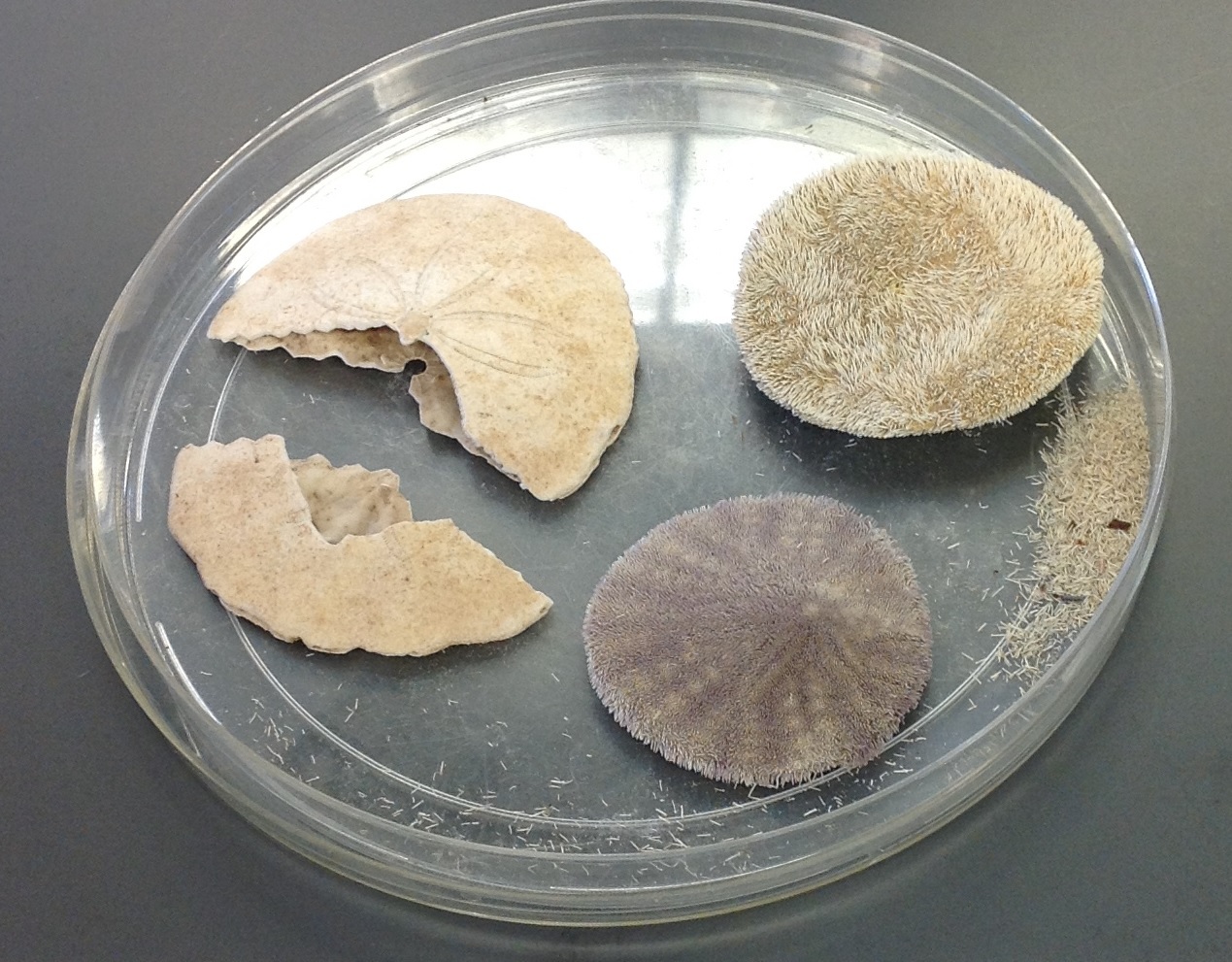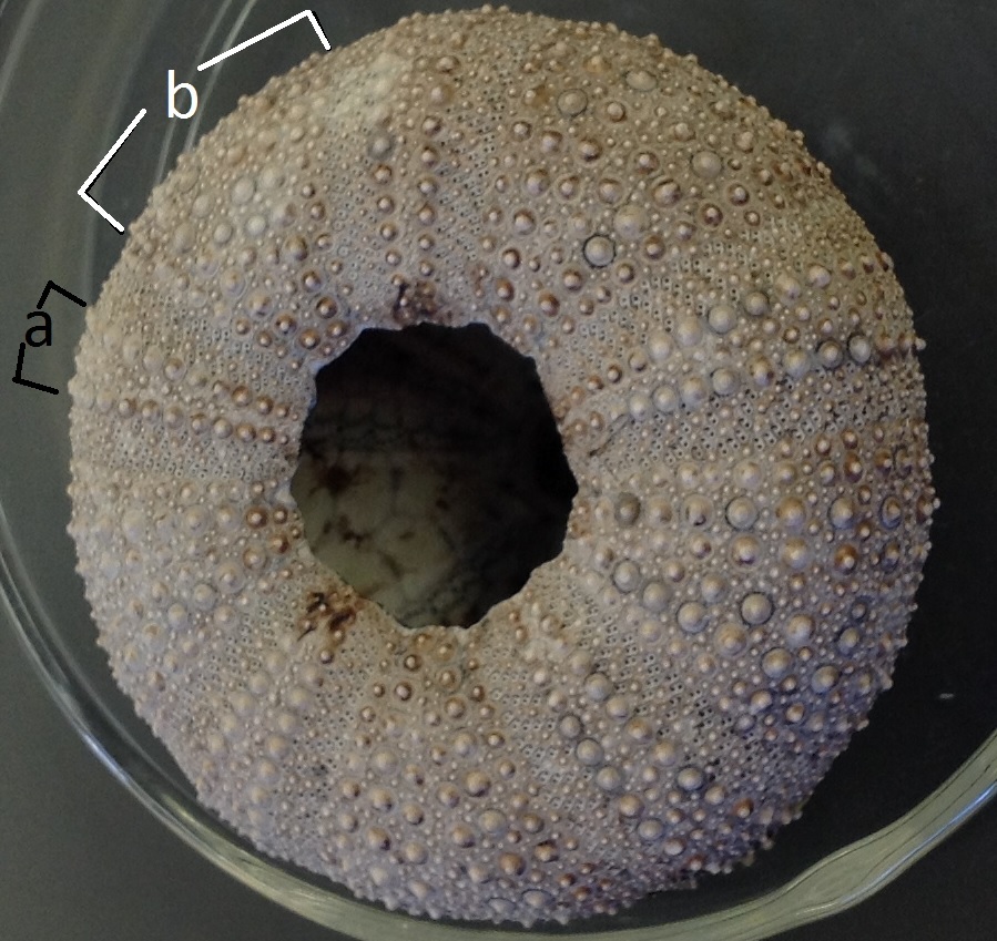Outer shell referred to as “test”. It is made of fused ossicles. IT is divided into amblacral zones and inter-ambulacral zones, but these are not visible unless spines are removed