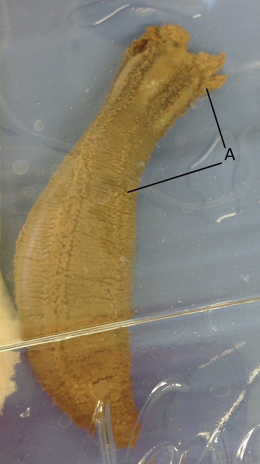 Name the phylum, class, and genus of this organism. Name the structures indicated. Why is this organism considered related to Sea Stars or Sea Urchins?