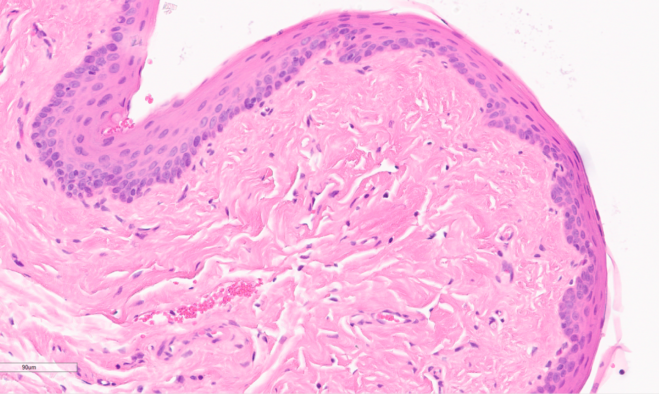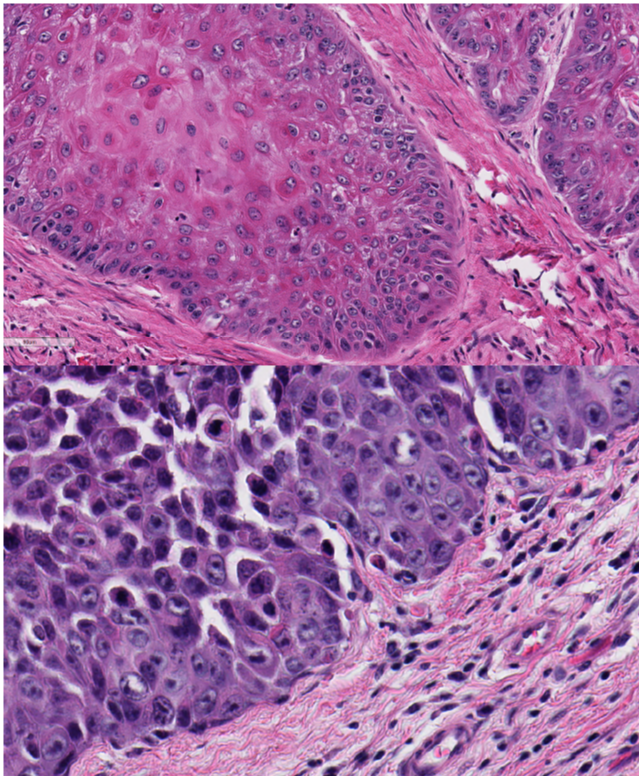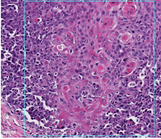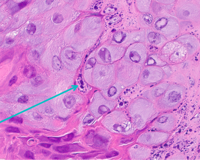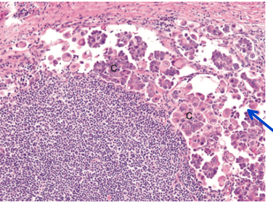 Lymphatic invasion is likely, which would mean invasion by single or clumps of neoplastic squamous cells into the lymphatic vessels within and surrounding the eye. Arrest of these cells in local lymph nodes and regional chains (parotid, retropharyngeal, cervical chain) and progressive movement with the lymph flow to empty into the right lymphatic duct, the thoracic duct, or directly into the vena cava near the thoracic inlet. The neoplastic cells then become blood borne and flow through the cranial vena cava, right atrium, right ventricle, pulmonary arteries and lodge in the small pulmonary arteries and capillaries where clusters of cells may take hold and set up secondary sites.