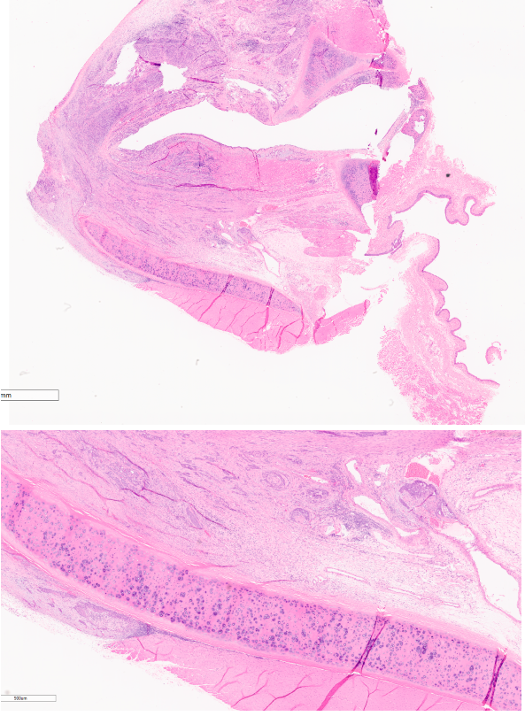 Lungs: Multifocal firm white nodules that are seen on the surface of all lung lobes. On cut surface, the masses are white and extending into the lung parenchyma.