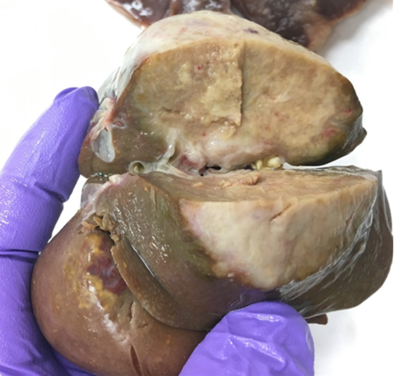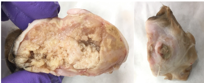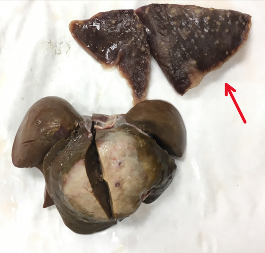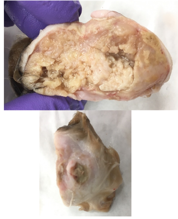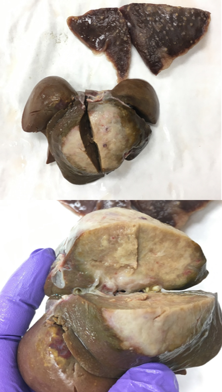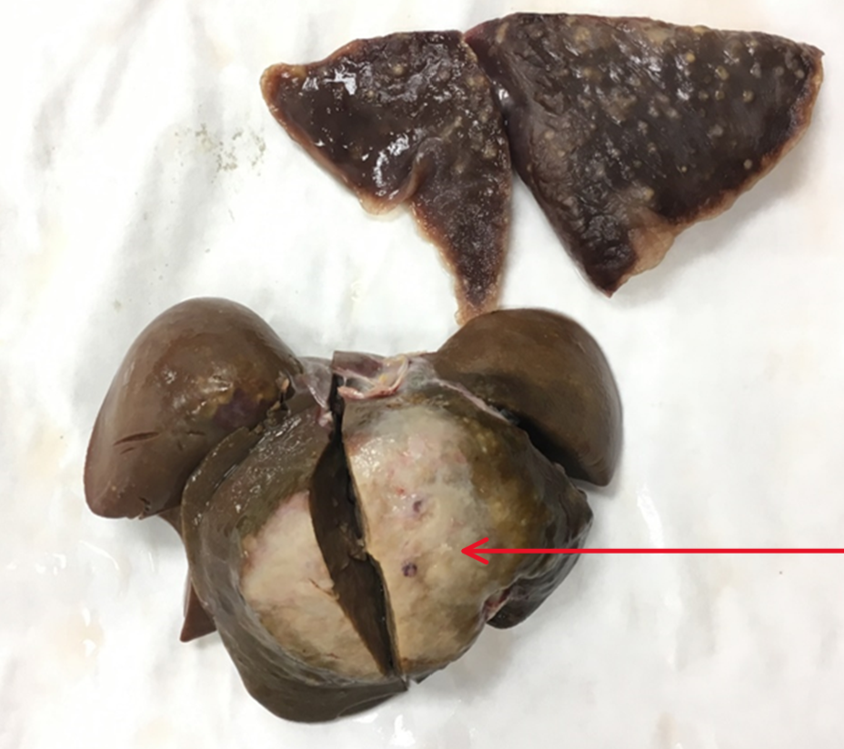 Focally, a circular, white to yellow, firm mass is present in the right medial liver lobe. Smaller, white to yellow nodules surrounded the larger mass. On cut surface, the mass is cream colored, smooth, and extended almost all the way through the liver lobe.