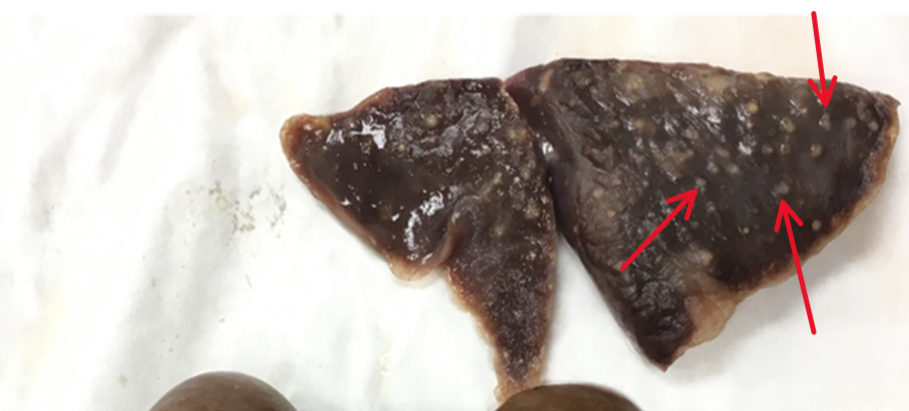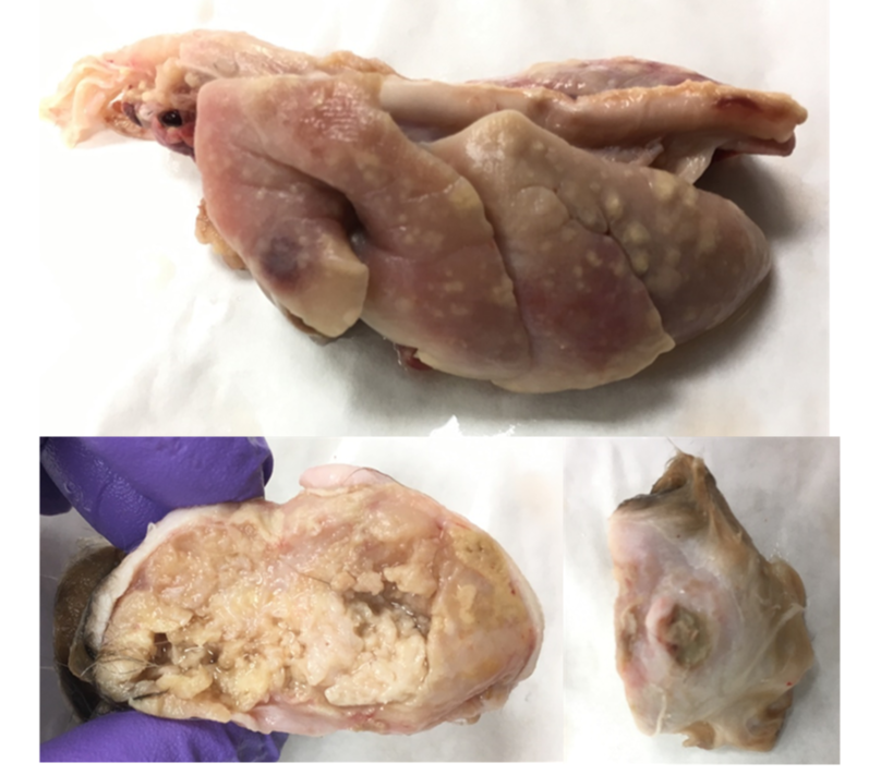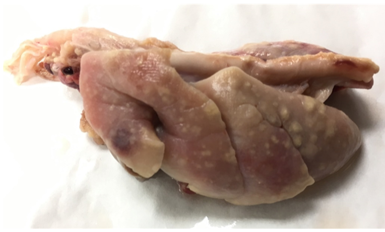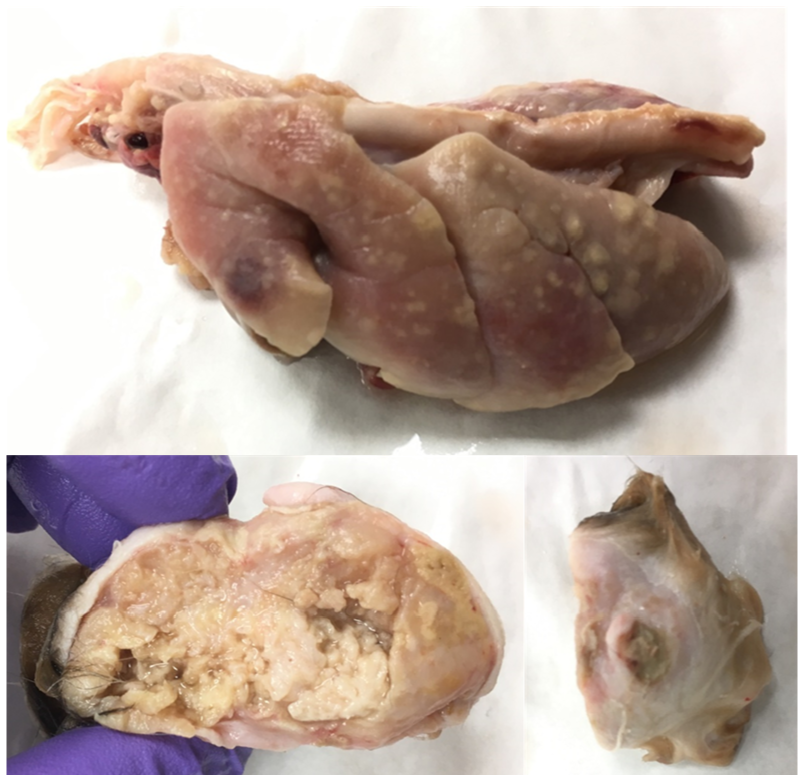 Lungs: Multifocal, small, raised, pale tan to white cavitated masses are scattered diffusely over the surface of all lung lobes. Masses range in size from 1 mm to 5 mm in diameter. On cut surface, the masses pale in color, firm, and extended into the lung parenchyma.