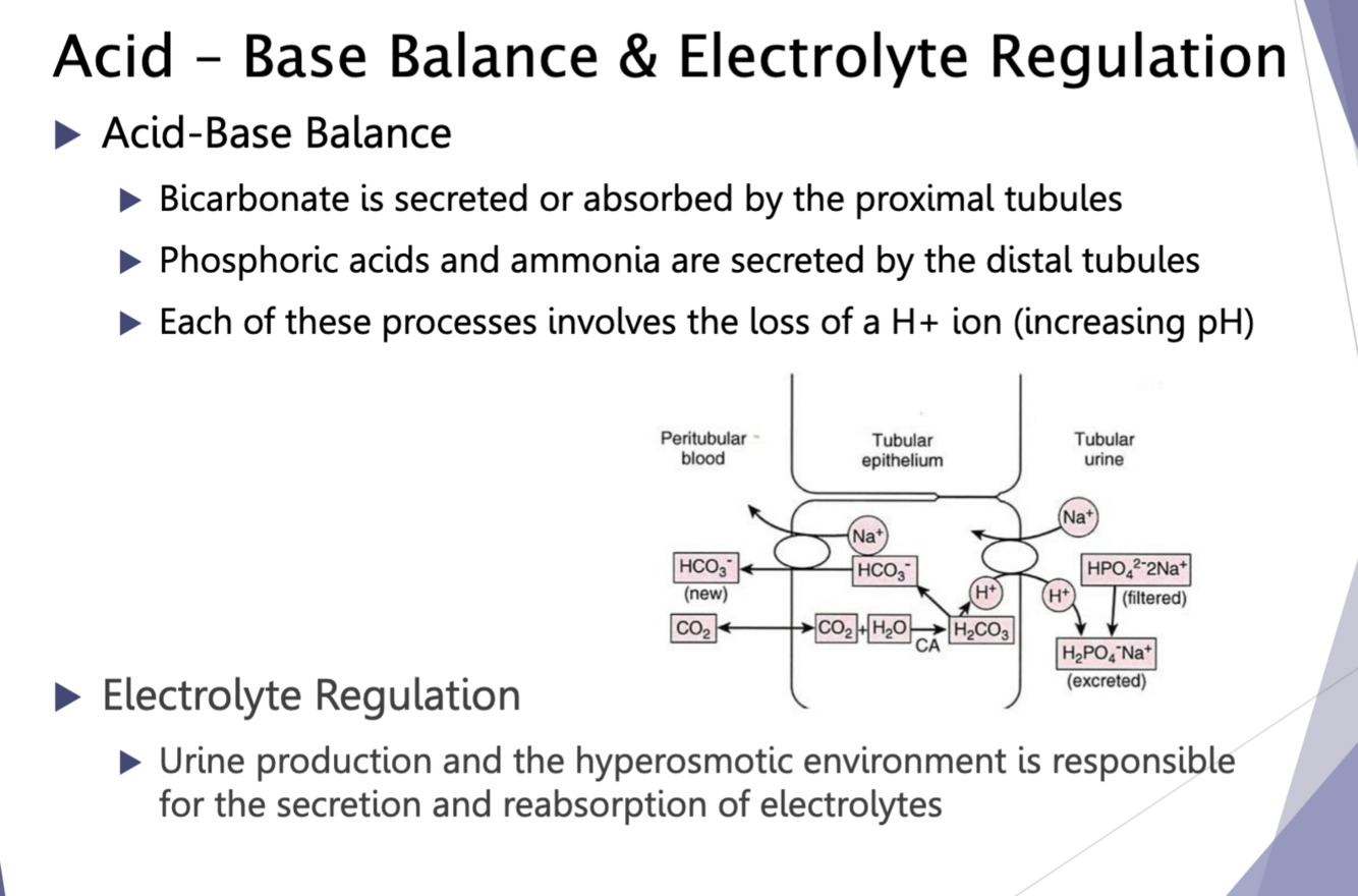 Urine production: nephrons control absorption and secretion of water, electrolytes, bicarbonate/hydrogen, & wastes