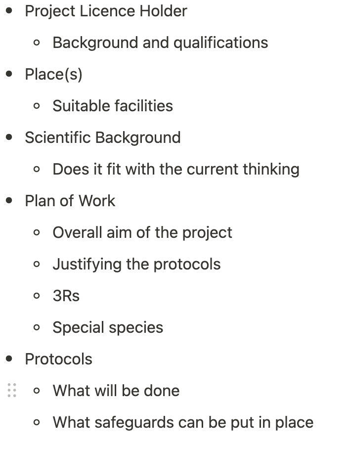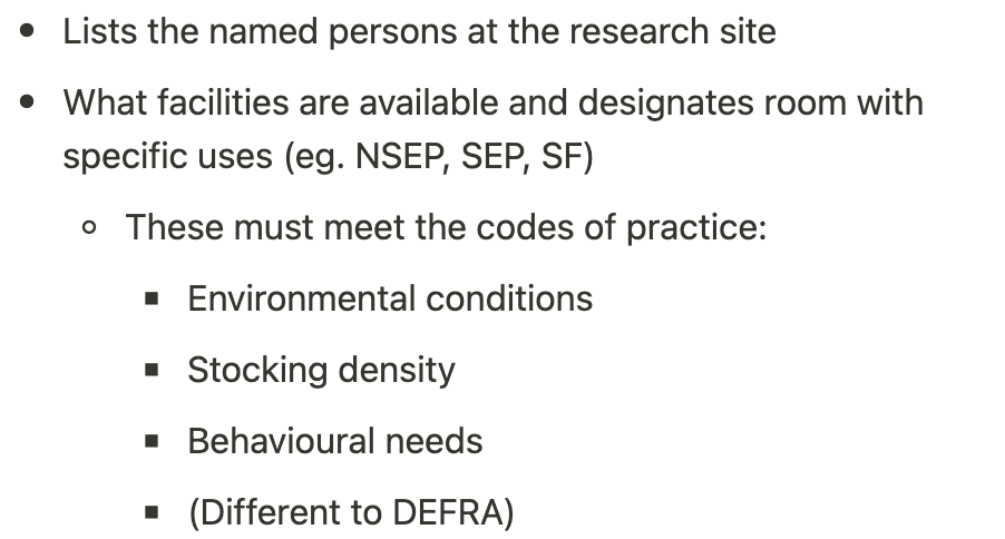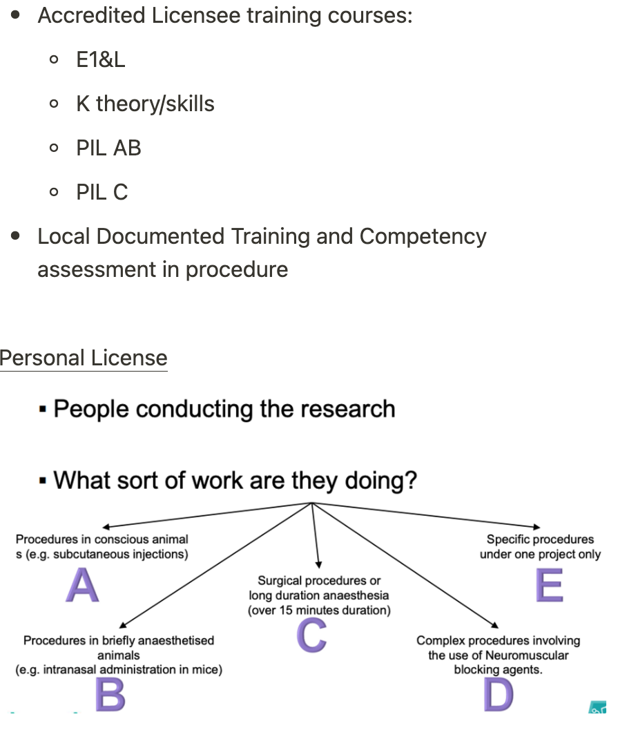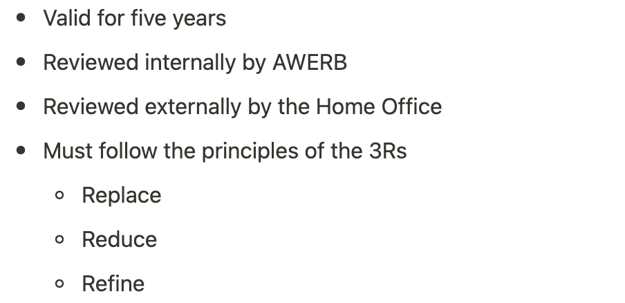 What animals are protected, What scientific procedures, Licences for peoples, work + location, Roles for those indivudlas caring for the animal, Training requierments for research, Source, care of + killing of animals