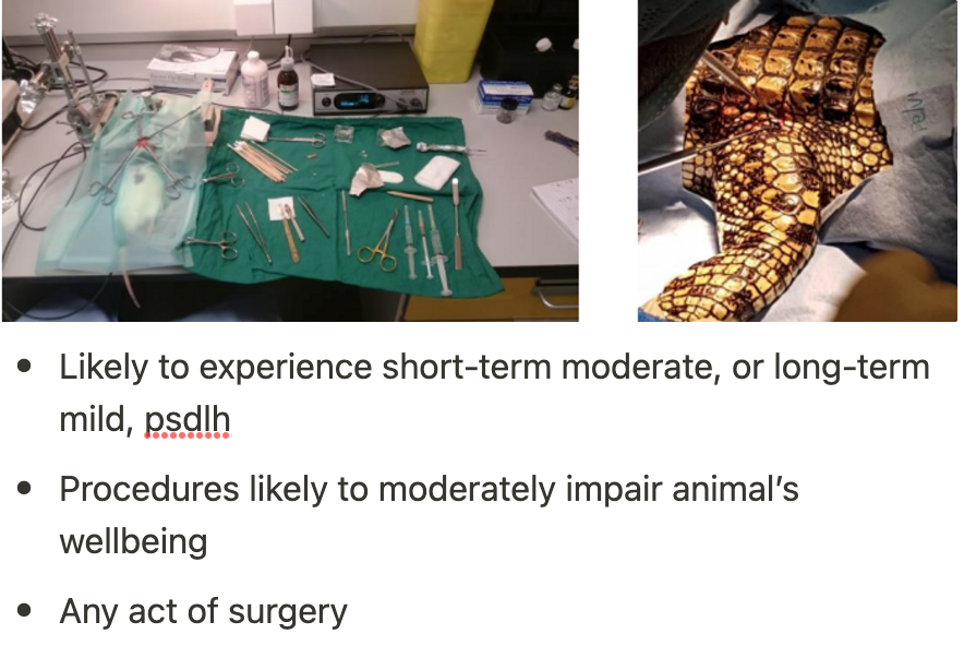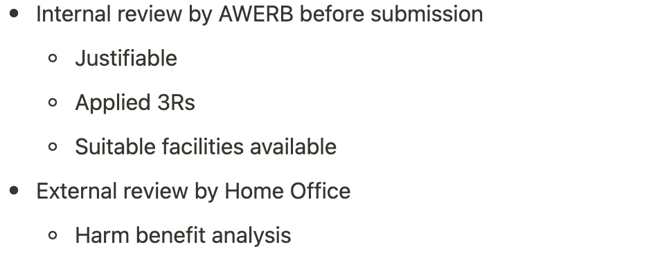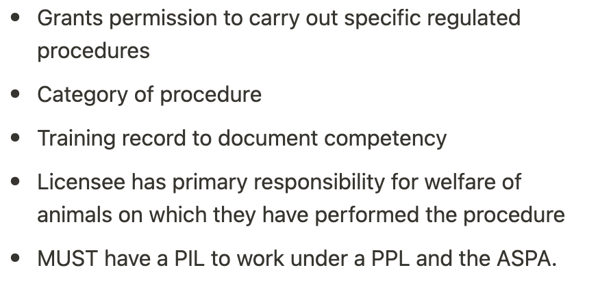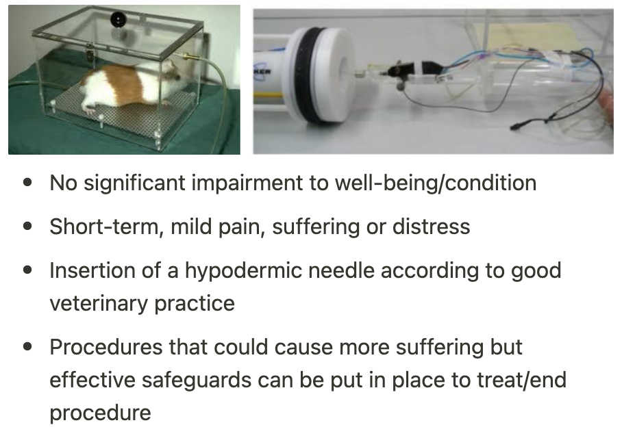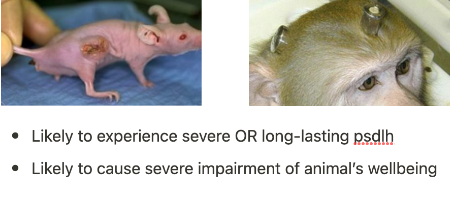 Any produce thay MAY cause pain, suffering, distress or lasting harm + carried out for a scientific purpose must be documented in a project licence,