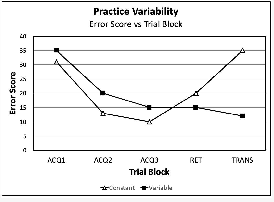 Typically constant practice outperforms variable practice in acquisition; however, variable practice outperforms constant practice in retention & transfer