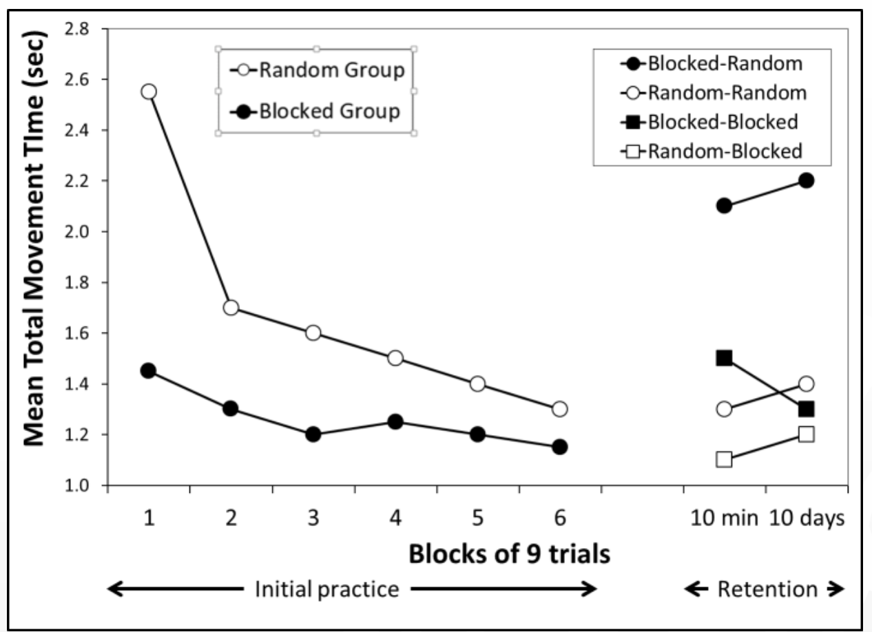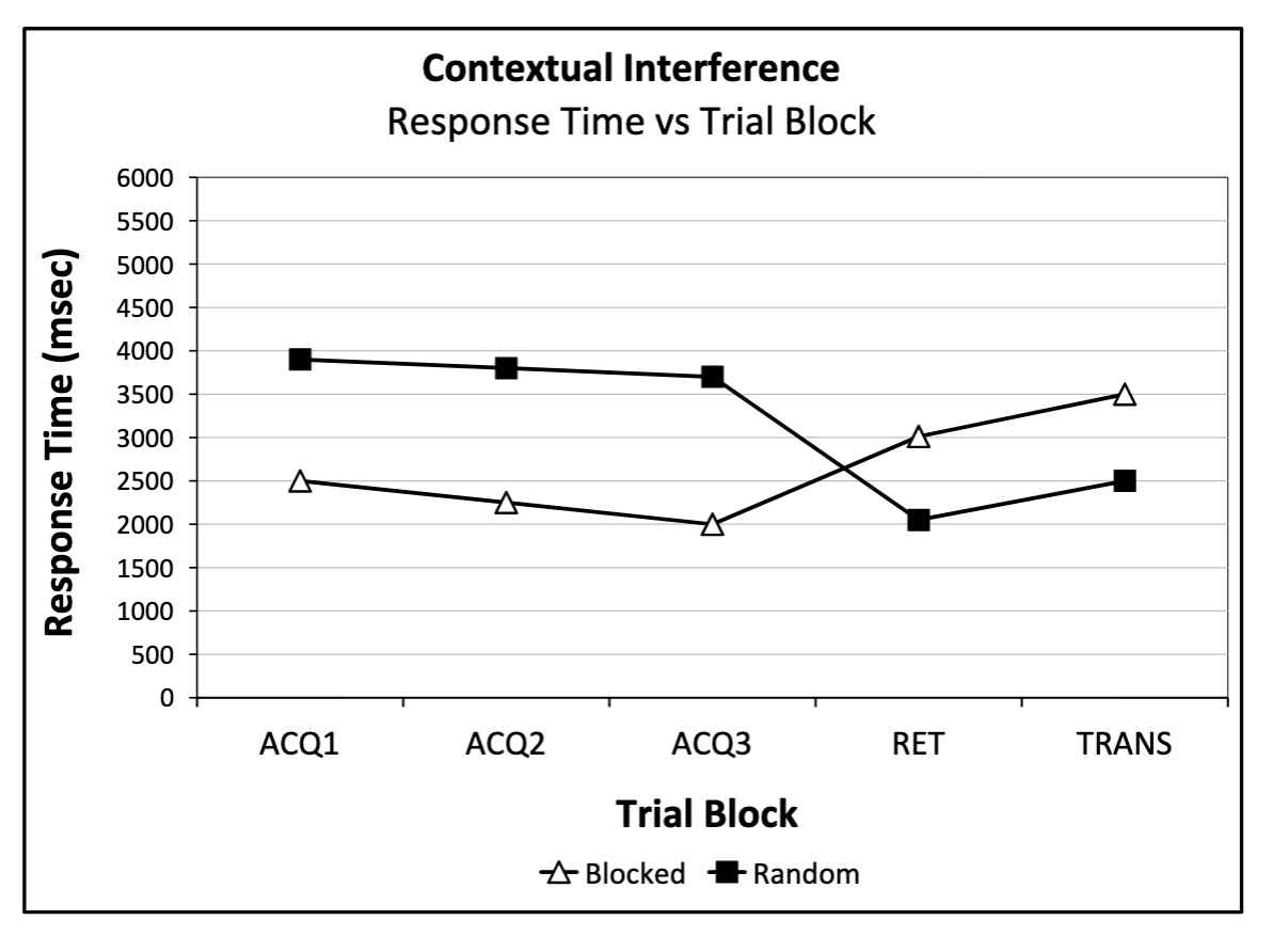 Random practice had longer responses times in acquisition, but blocked practice had longer response times in retention