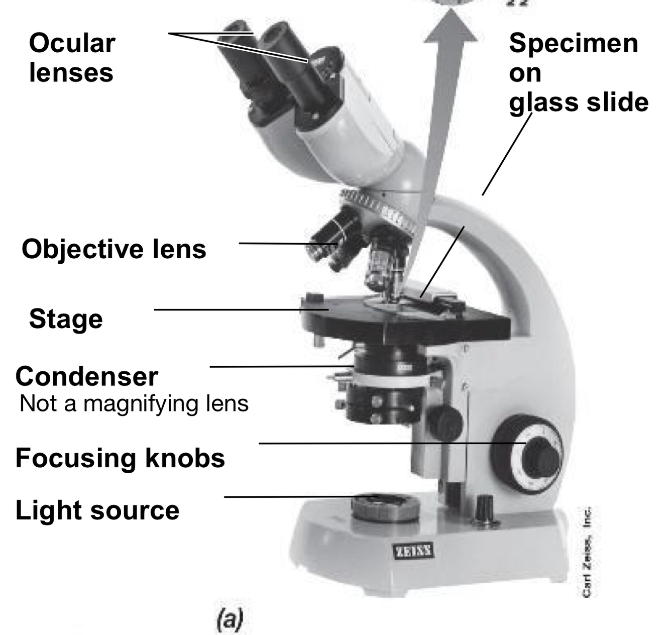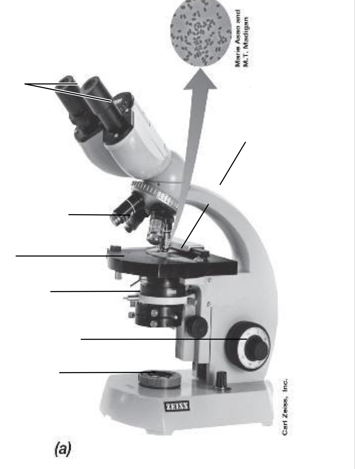 Condenser - focuses light to illuminate specimen (Close to the stage as possible)