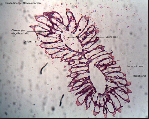 Cross-Section of Sponge: know following structures and know their functions: osculum, spongocoel, ostia.