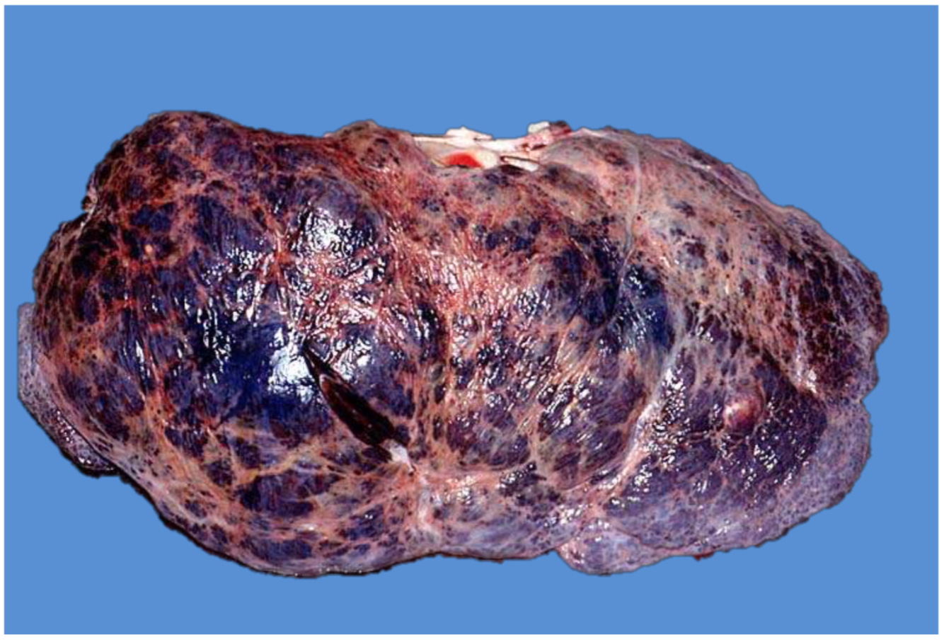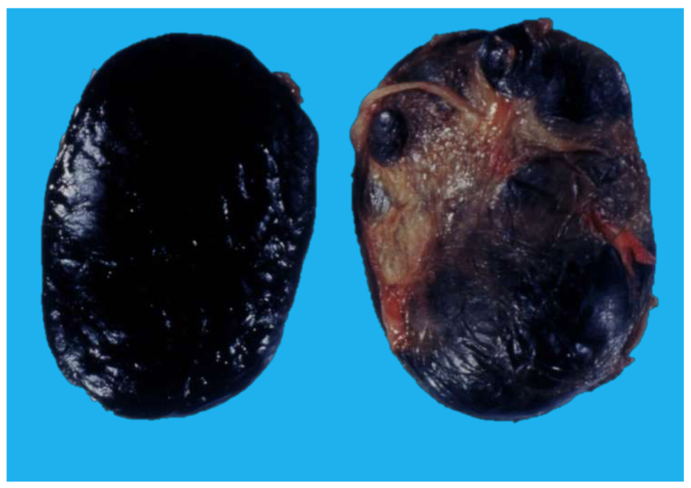 Enlarged lymph nodes with diffuse dark brown to black pigmentation