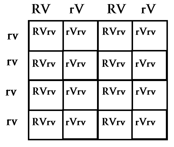 Make a probibilty chart for a Dihybrid cross between a Red flower (with one red allele and one white) and one White flower.
