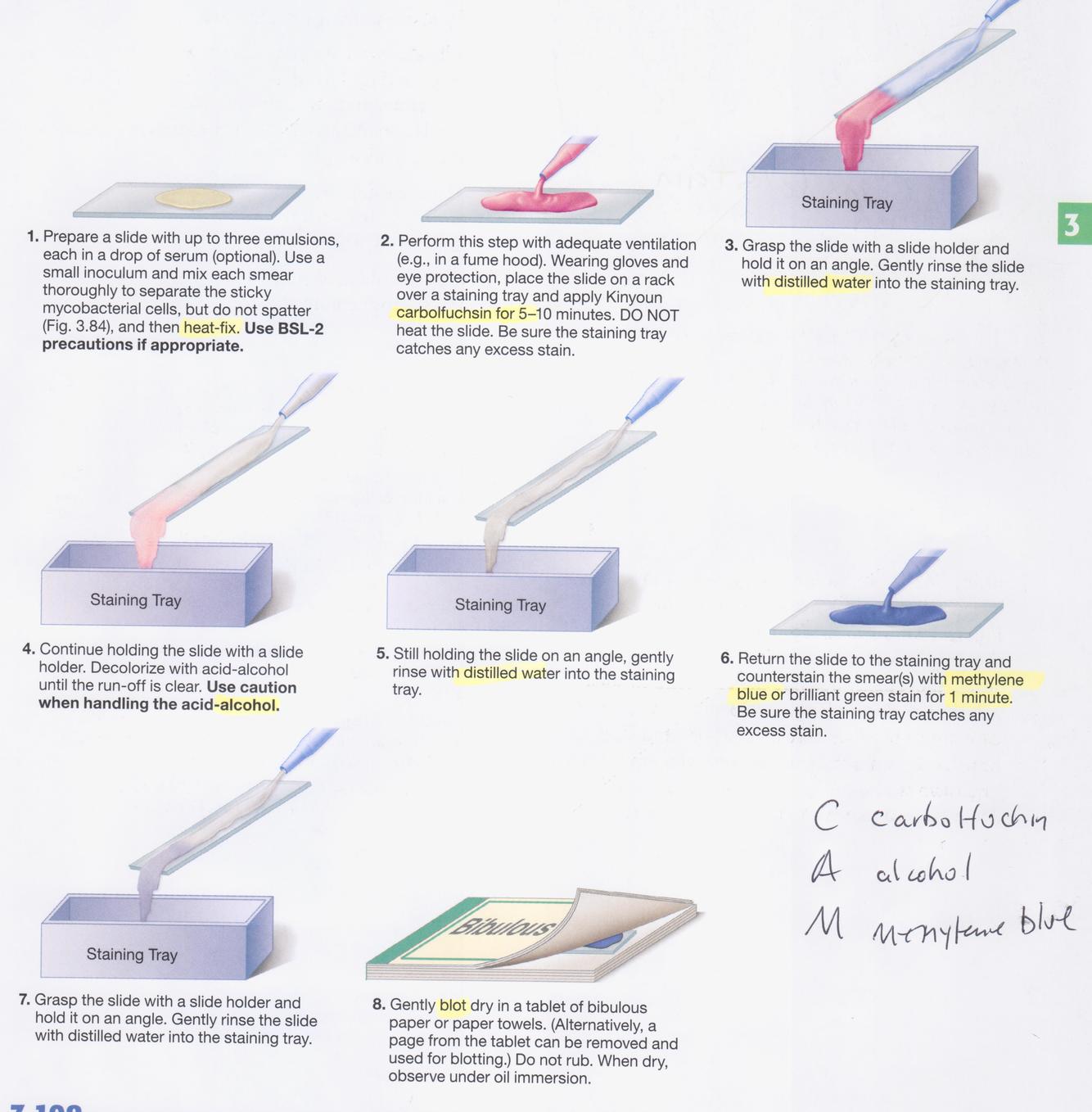 Heat fix, carbolfuchsin, water, alcohol, water, MB, water, blot