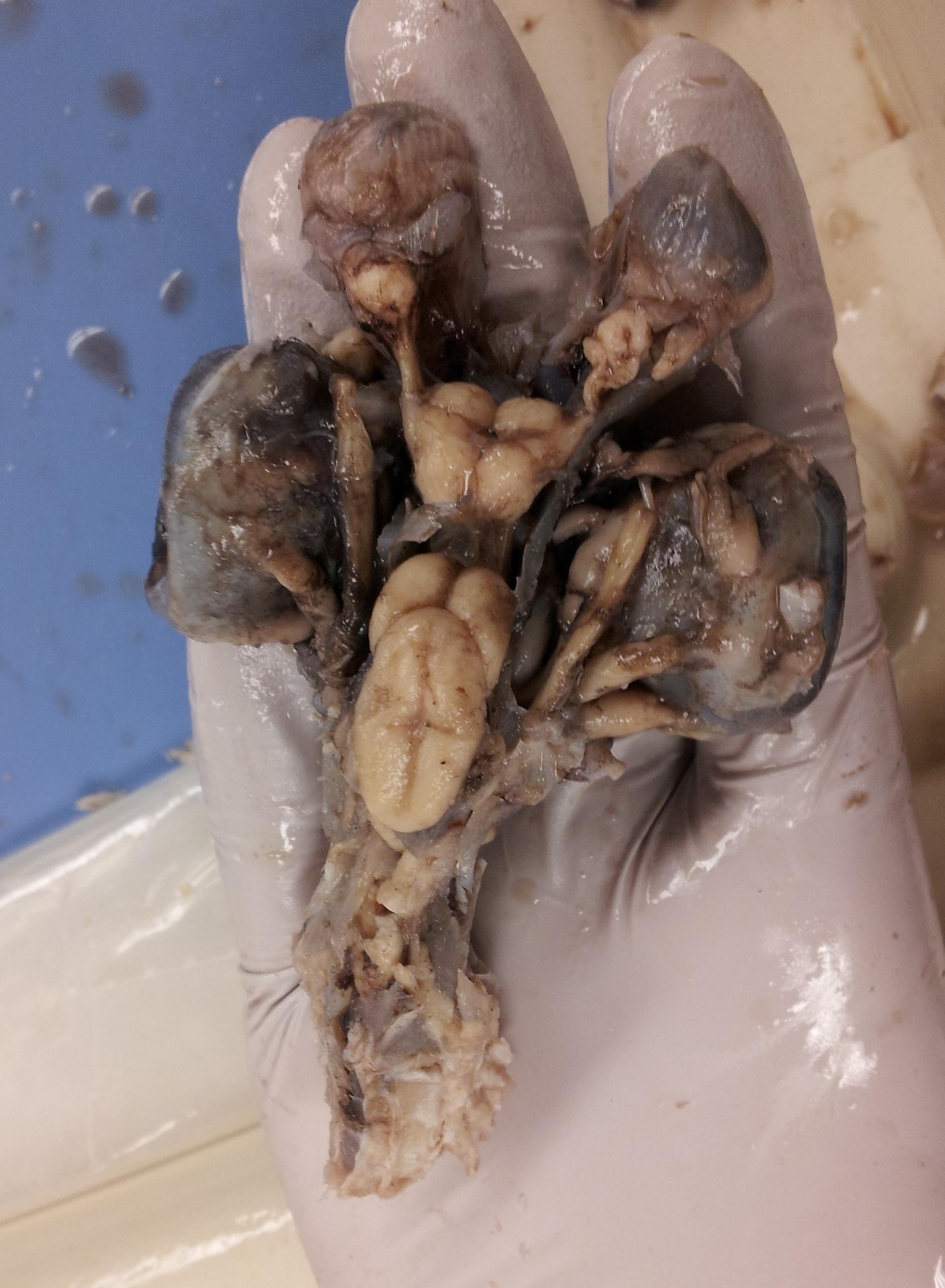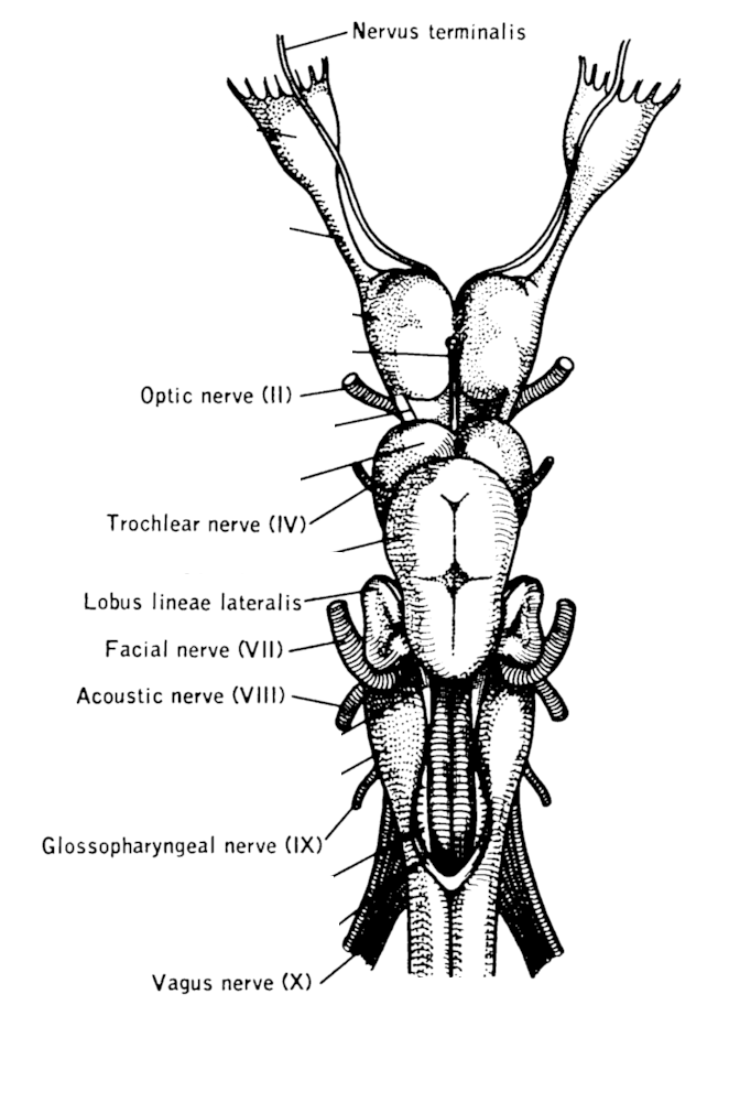 Squalas has 10 cranial nerves labelled in roman numerals starting at the rostral end.