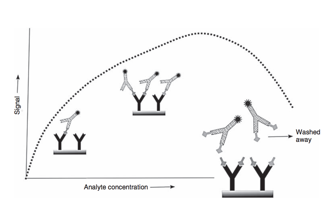 Falsely low values in the presence of large amounts of analyte (analyte saturates BOTH the capture and detection antibodies prior to formation of a sandwich complex)