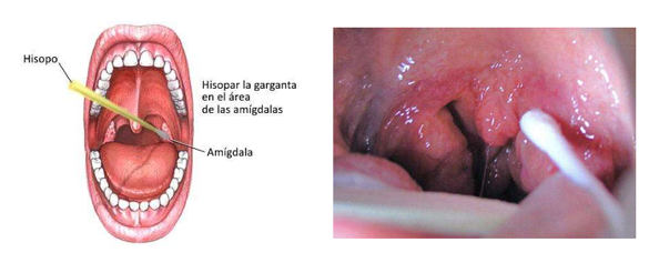 Procedimiento: para la toma de muestra son necesarios dos hisopos. Se utilizará un bajalengua y se evitará rozar cualquier parte de la lengua con los hisopos. Uno de ellos se utilizará para hacer la investigación de microorganismos por cultivo, y el otro para hacer la detección de S. pyogenes por técnica molecular inmunológica (Test rápido).