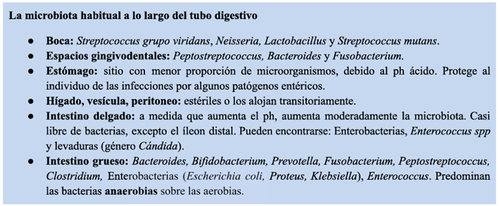 Como está constituida la microbiota habitual de cada parte del tubo digestivo?