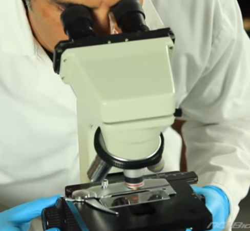 What objective power do you begin with when looking at a slide?
