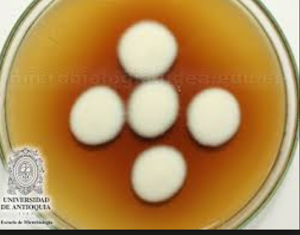 Small white, fluffy, button- colony spreads rapidly; can be diagnosed after 2-3 weeks. (Upper side cream to light under side dark brown)