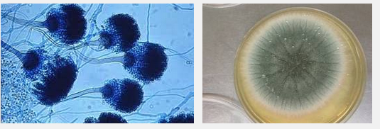 Color- white- yellow (A. flavus), grey- green (A. fumigatus), black (A. niger)