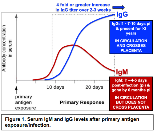 4-fold or greater increase in IgG titer in serial serum samples taken at least two weeks apart