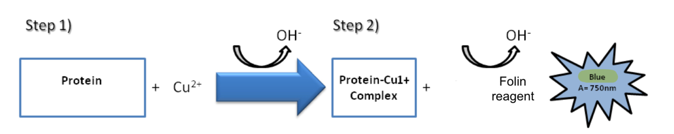 protein + Cu2+ -> protein-Cu1+ complex + Folin reagent