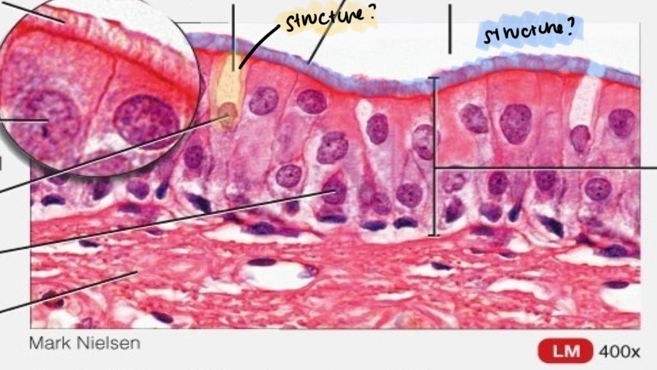 What are the yellow structures in the image? What are their function? What kind of epithelial cells would you find them with?
