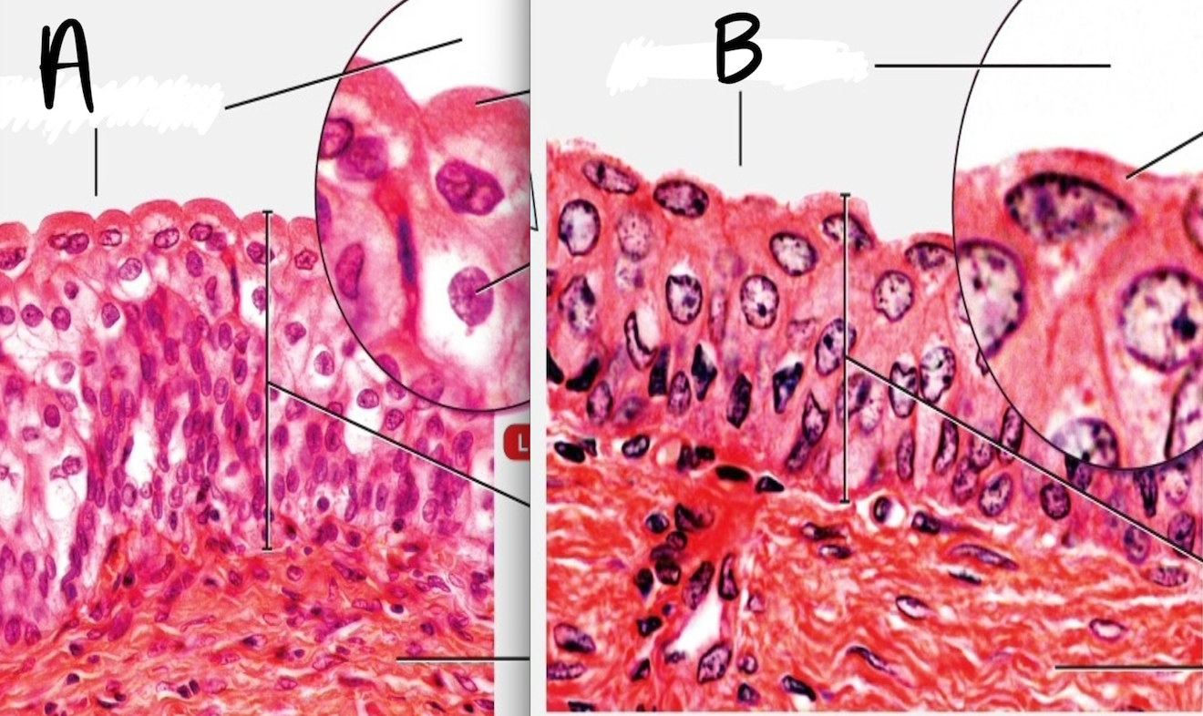 What is this type of tissue? What is on its apical surface? Where would it be found? What are its functions? What is the difference between A and B?