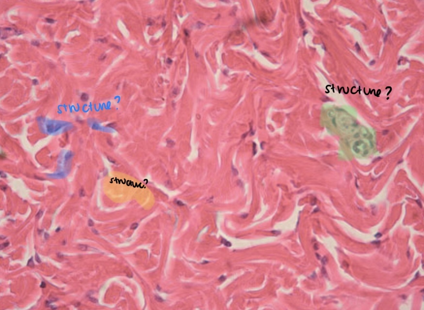 What kind of connective tissue is this? What are all the highlighted structures? Where would you find this kind of CT and what is its function?
