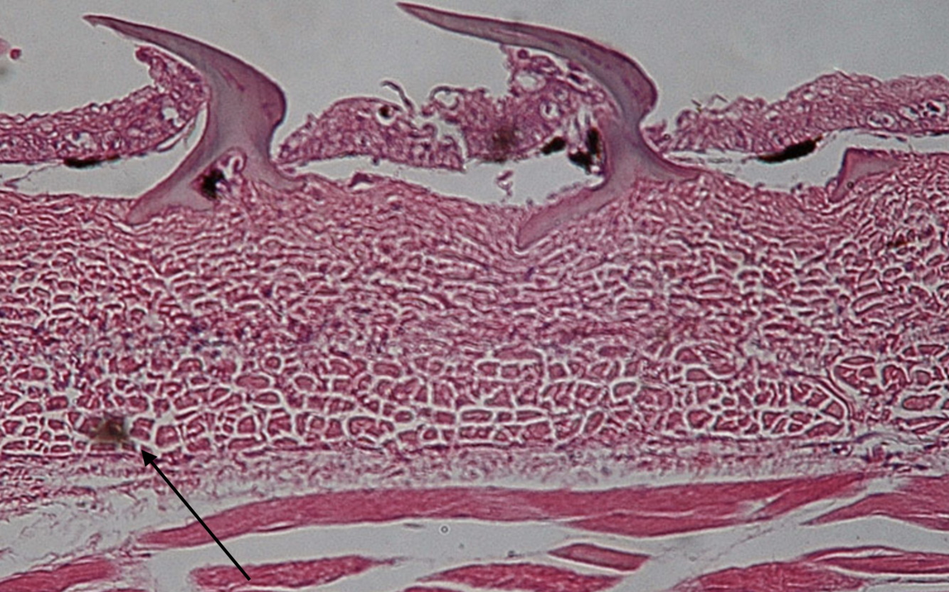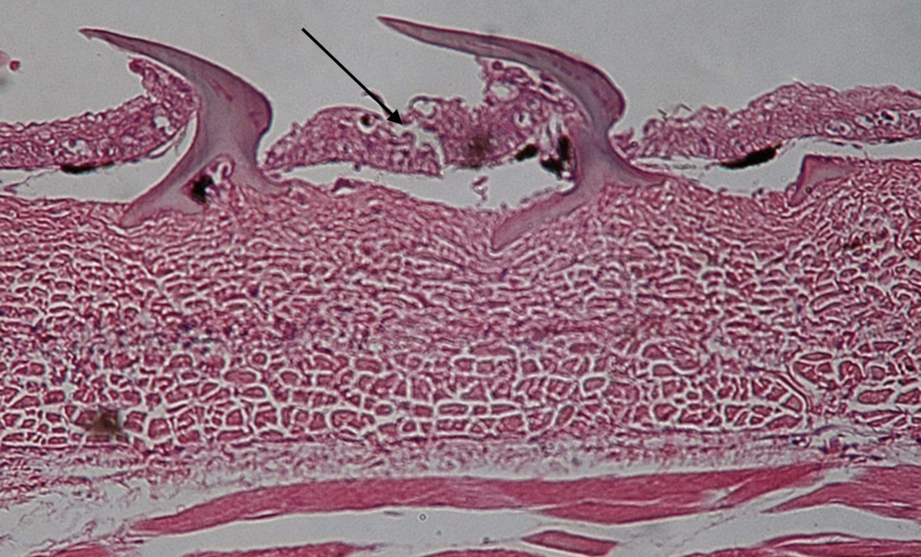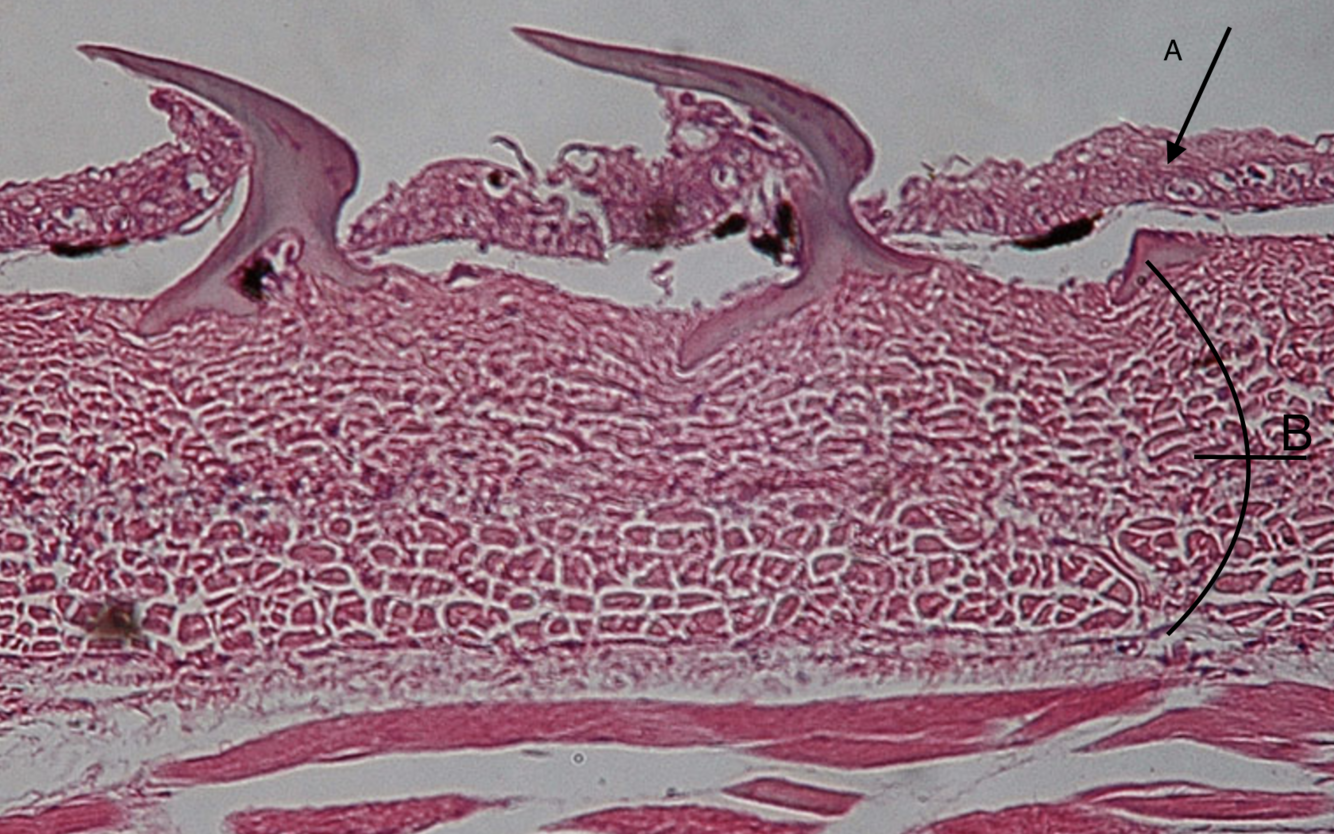 no enamel, dentin, or vascular bone - just lamellar bone in fringe projections along posterior margin - teleosts