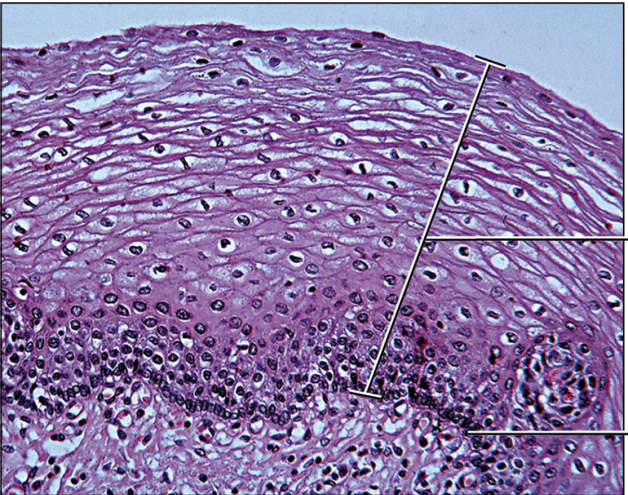- top line = stratified squamous layer