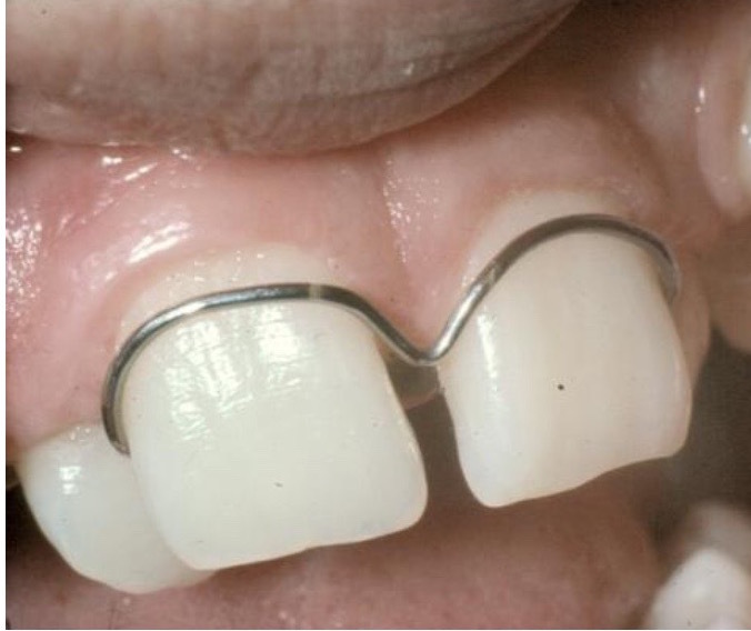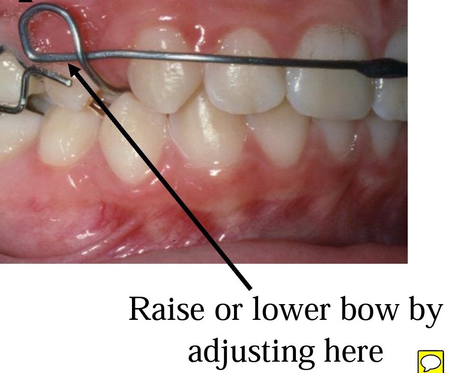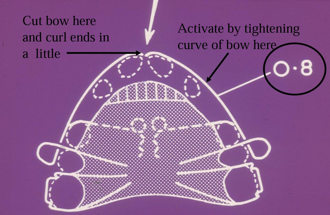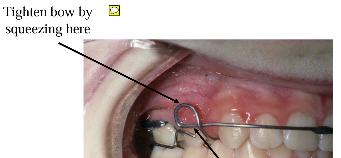 Once canines have been moved into the wanted position by the spring we split the bow to make it much more flexible while retracting the incisors (curl the ends a little) -> to get the right force and good range of action = needs to activate 3 mm = tighten curve of bow in area where canines used to be