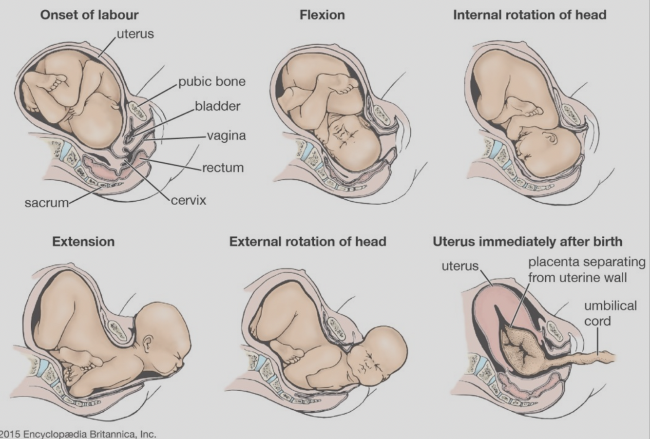 Foetal head then rotates internally as it gets to the pelvic floor, before extending the neck to pass out the pelvic outlet with the head in the occipito-anterior position