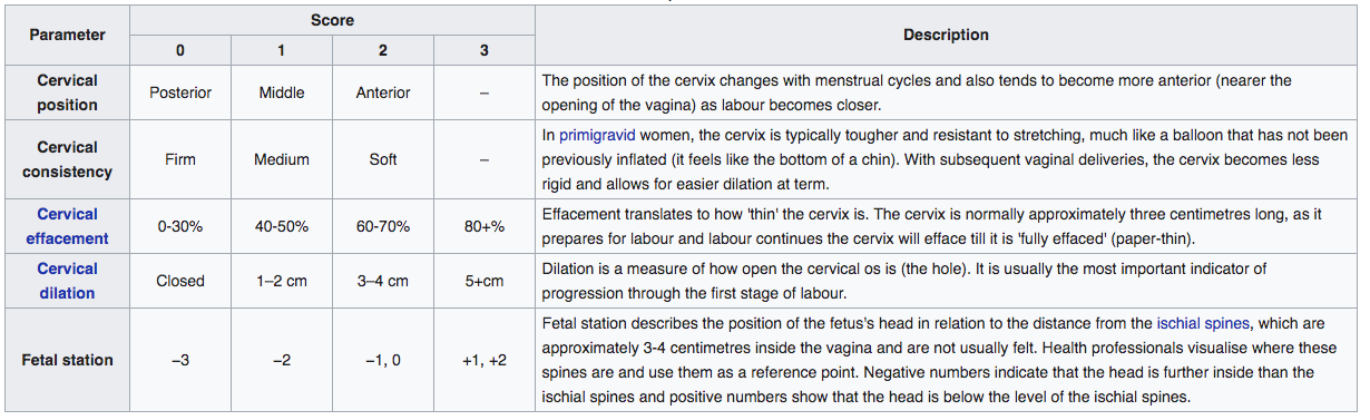When performing a vaginal exam, what is the midwife looking at in terms of the Bishop Score?
